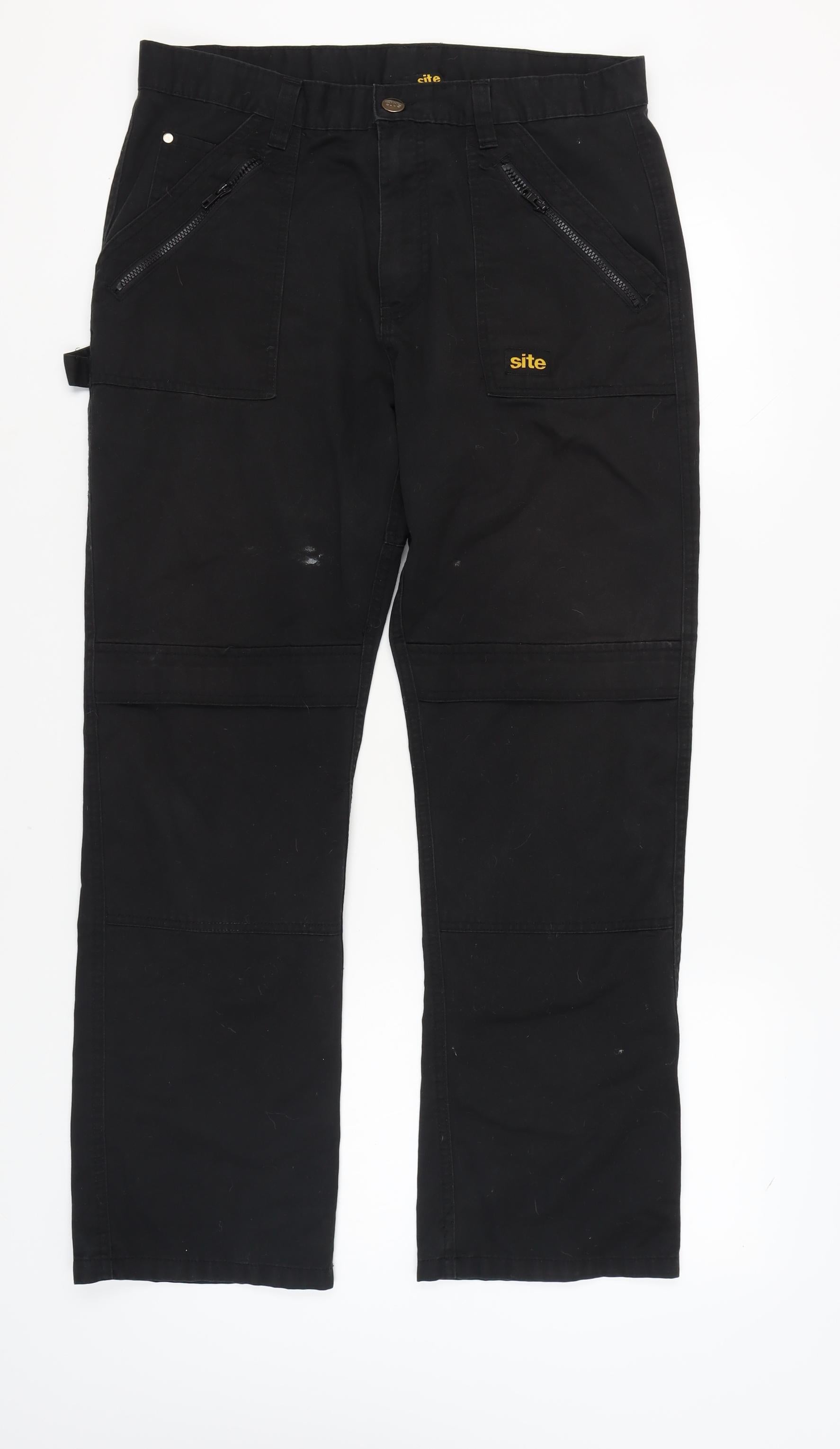 Discover the practicality and style of these Site cargo trousers, ideal for both casual outings and workwear. Crafted from a durable blend of 65% polyester and 35% cotton, these trousers promise comfort and longevity. In a versatile black colour, they feature a mid-rise fit with a flat front for a clean and modern look. The design includes multiple pockets for convenience, perfect for carrying essentials. A button and zip closure provide secure fastening, while the elastic waist offers flexibility and comfort.Ideal for the autumn and winter seasons, these trousers ensure you stay warm while appearing effortlessly stylish. The straight leg style complements various footwear options, making it easy to transition from work boots to casual sneakers. With the Site logo as an accent, these trousers subtly showcase the brand's signature style.Though they exhibit minor signs of wear, these trousers remain a functional and fashionable choice. Whether you're on the job or enjoying a weekend outing, their practicality and classic design make them a wardrobe staple. Easy to care for, simply toss them in the washing machine, and they’re ready for your next adventure.Don’t miss out on adding these essential black cargo trousers to your collection. Perfect for those who value comfort and style, they provide the versatility needed for your busy lifestyle.