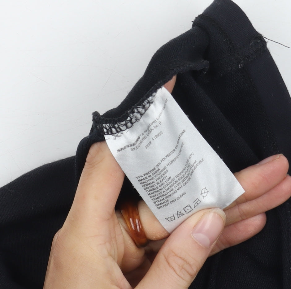 Elevate your everyday casual wardrobe with this essential Skechers women's T-shirt in classic black. Designed for both style and comfort, this T-shirt is crafted from a soft and durable blend of viscose, polyester, and elastane. The fabric offers a natural stretch that makes it perfect for any type of movement, whether you're heading to the gym or enjoying a leisurely day out. Featuring a classic crew neck and short sleeves, this T-shirt seamlessly blends into your casual attire. Its regular fit ensures a comfortable and relaxed feel, while the solid black colour provides a timeless and versatile look that pairs easily with your favourite jeans or activewear bottoms. This basic T-shirt, with its contemporary simplicity, is suitable for a range of occasions, including activewear, giving you the freedom to express your personal style with ease. Machine washable for easy care, this T-shirt promises long-lasting quality and a fresh look every time you wear it. In excellent condition, this piece is a must-have addition to your wardrobe, combining functionality with effortless style. Secure your own Skechers Women's T-Shirt today and experience the blend of style and utility.