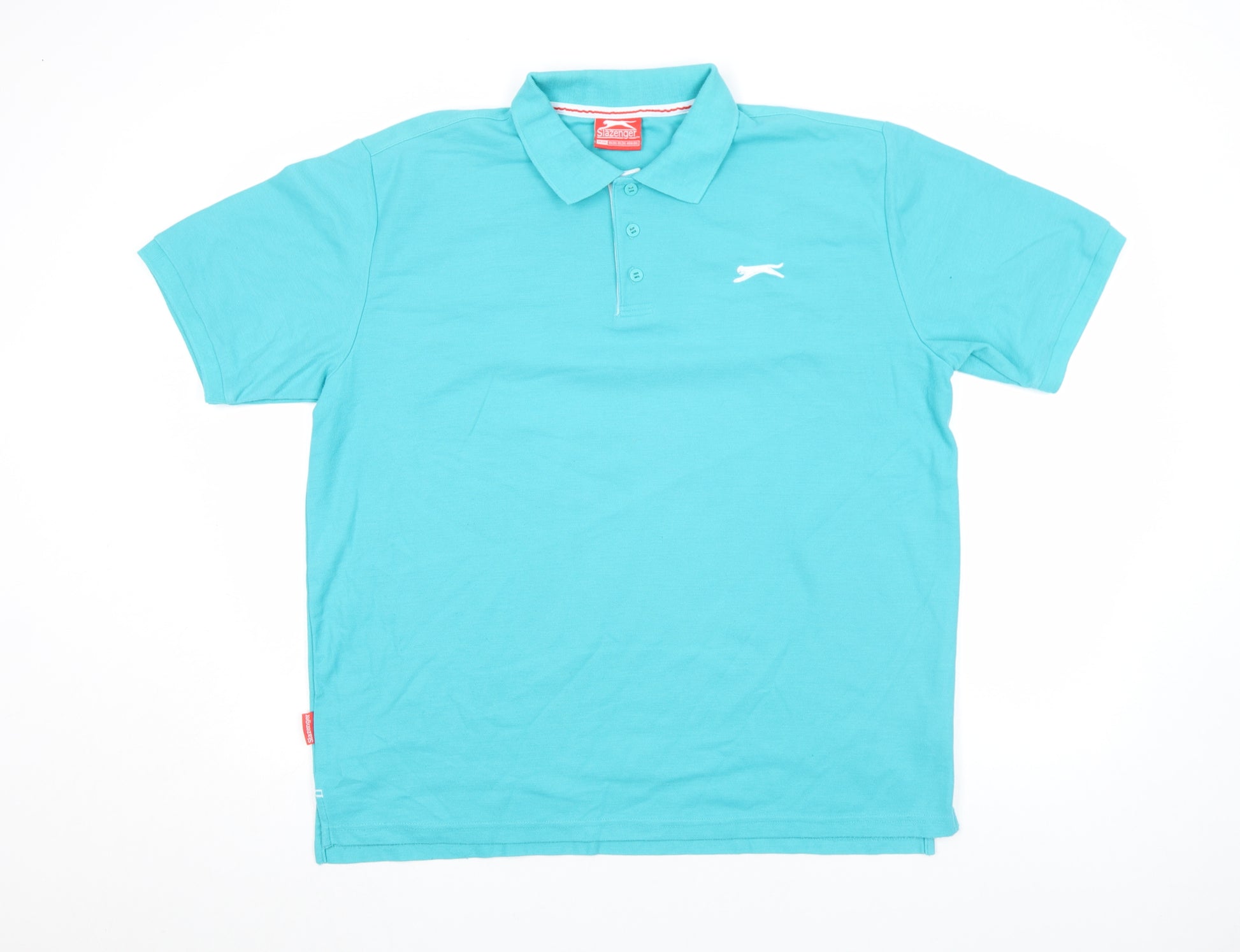Upgrade your casual wardrobe with this classic Slazenger Men's Blue Polo Shirt in size 2XL, delivering the perfect combination of sporty sophistication and relaxed comfort. Crafted from 100% cotton, this breathable and lightweight polo ensures exceptional comfort throughout the day, making it ideal for active use and casual wear alike. The crisp blue colour adds a vibrant touch to any outfit, while the iconic Slazenger logo embroidered on the chest gives it an instantly recognisable and stylish finish.Designed for men who appreciate both functionality and timeless design, this regular-fit polo features a collared neckline with a neat three-button placket, providing a comfortable and adjustable wear experience. The short sleeves and soft jersey fabric construction make it a great choice for warmer seasons like spring and summer, perfect for golf sessions, tennis matches, walking, gym workouts, or laid-back weekends.Whether you're heading to the clubhouse, spending a weekend away, or just want a polished yet casual look, this Slazenger polo offers excellent versatility. The moisture-wicking and breathable cotton fabric keeps you cool and fresh, while the brand’s attention to detail ensures durability and quality. Pair it effortlessly with chinos, shorts, or jeans for a smart-casual look.This polo shirt is in very good pre-owned condition, showing only light creasing and no visible flaws, reflecting its well-maintained state. Machine washable for easy care, this piece is built for everyday simplicity and long-lasting wear. Add a touch of sporting heritage to your wardrobe with this Slazenger classic — a reliable go-to for men who value comfort, quality, and clean styling. Ideal for both active days and casual evenings, this blue Slazenger polo shirt is the perfect blend of sportswear and style, ready to be worn season after season.