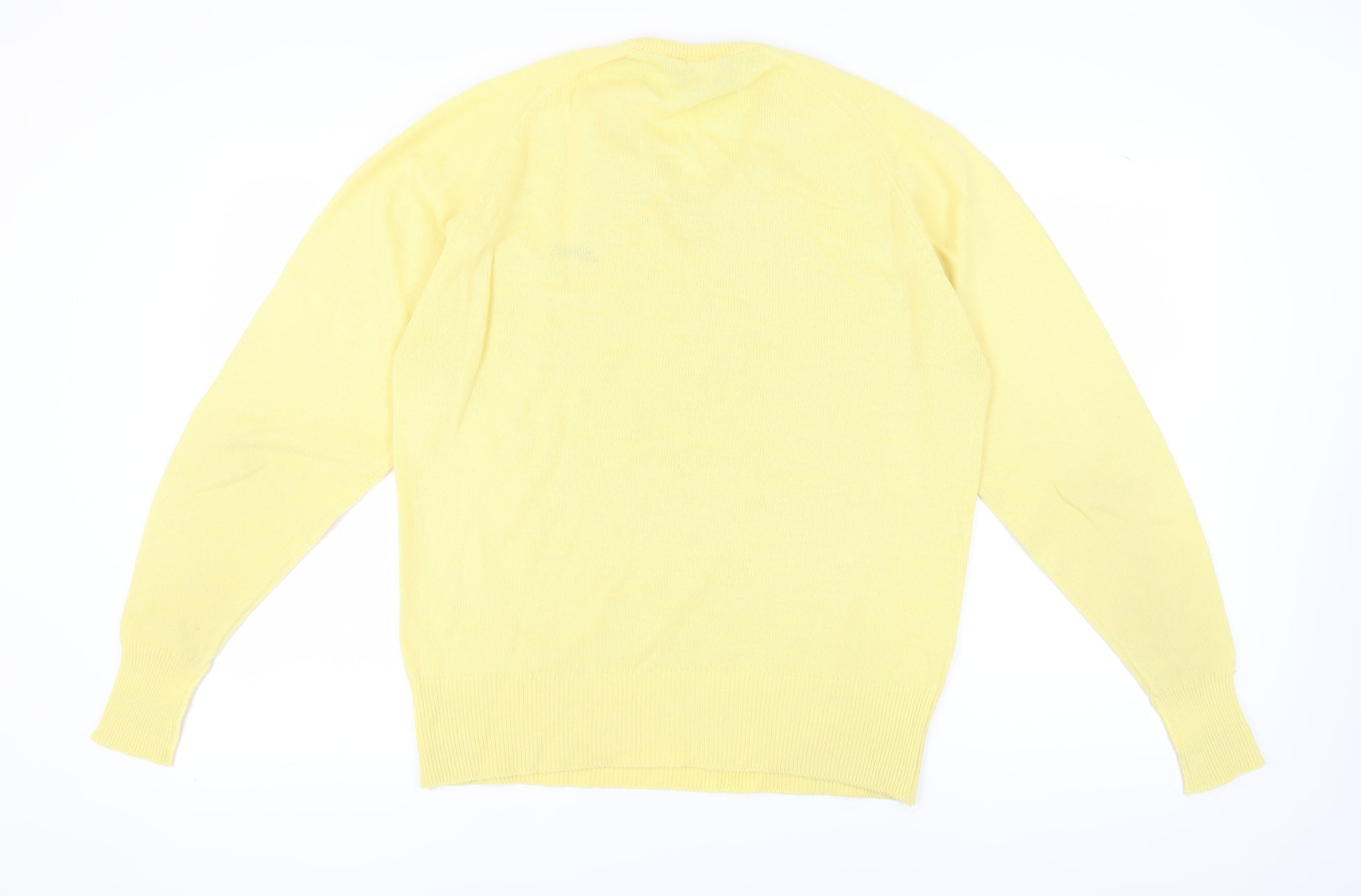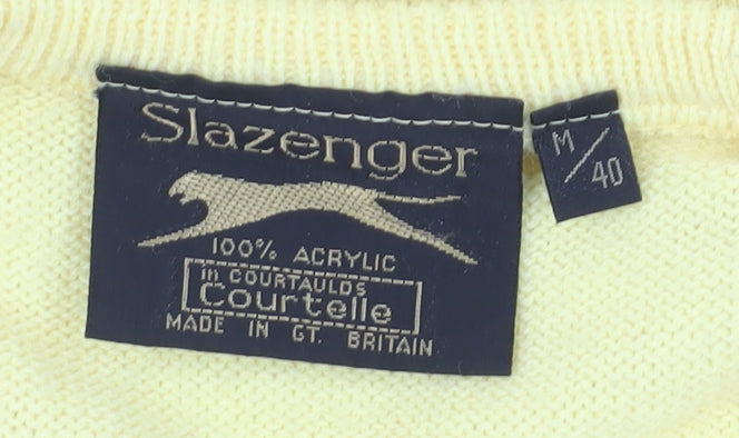 Embrace vintage style with this classic Slazenger men's jumper, a timeless piece crafted to offer both comfort and flair. This yellow pullover is made from 100% acrylic, ensuring a soft and cozy fit that’s perfect for all seasons. With its tight-knit construction, it presents a sleek and neat appearance, ideal for casual outings. The V-neck neckline adds a touch of elegance, allowing for versatile layering over shirts or tees. The iconic Slazenger logo accentuates its heritage, showcasing a subtle brand presence on the chest.Designed for regular fit, this medium-sized jumper suits a broad range of body shapes and sizes. The long sleeves further enhance its practicality, providing warmth during cooler days while maintaining a lightweight feel that doesn’t compromise on breathability. Easy to maintain, this knit pullover is machine washable, making it convenient for everyday wear without the hassle of special garment care.Whether paired with jeans for a relaxed day out, or coordinated with khakis for a more refined look, this yellow Slazenger jumper offers endless styling possibilities. Its understated design makes it a versatile piece that complements a variety of personal styles, while its vintage appeal and excellent condition ensure it remains a valued part of any wardrobe.Highlight your casual wardrobe with this Slazenger original, a reliable choice for those who appreciate quality and style. Its perfect blend of function and fashion makes it an attractive option for casual occasions, delivering a standout look with minimal effort. Despite being a vintage piece, its condition mirrors the freshness of a brand new item, free from signs of wear or damage, ready to bring a nostalgic touch to your collection.
