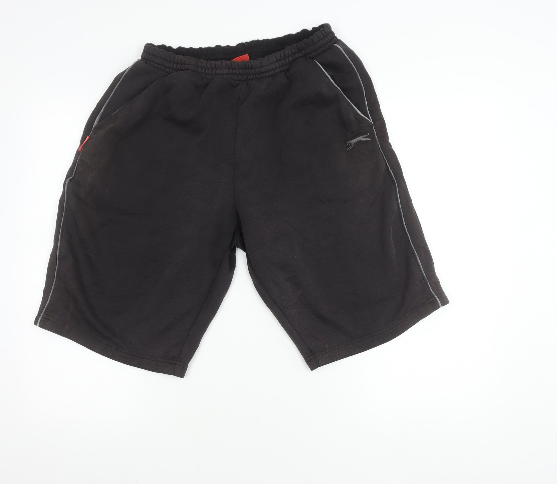 Stay comfortable and stylish during your workouts with these Slazenger unisex athletic shorts in classic black. Designed with performance in mind, they are perfect for a wide range of sporting activities including gym training, running, jogging, and casual walking. Featuring a lightweight construction and breathable jersey fabric, these shorts allow for ease of movement while keeping you cool and comfortable.Crafted from a soft blend of polyester and cotton (65% polyester, 35% cotton), these Slazenger shorts strike the ideal balance between durability and comfort. The elasticated waistband with a functional drawstring provides a secure and adjustable fit, making them versatile for different body shapes. Pockets add practicality, offering a place to keep small essential items while on the move.The shorts come in a regular fit and size Large, making them suitable for everyday activewear or casual use. The simple, no-pattern design in a solid black colour with subtle branded detailing ensures they can be easily paired with different tops and trainers, allowing seamless integration into your sportswear rotation.Whether you're hitting the gym, enjoying a run outdoors, or simply looking for comfortable lounge shorts, these Slazenger training shorts are a dependable choice. Their machine-washable fabric means caring for them is hassle-free, while their strong construction ensures they remain reliable across multiple wears.These shorts are in very good used condition with only minor signs of wear, including some light lint typical of pre-owned black garments. Despite this, they maintain excellent function and appearance, making them a great budget-friendly option for anyone seeking quality sportswear at a fraction of the cost of new retail prices.Add these versatile, easy-to-style Slazenger black gym shorts to your wardrobe today for a reliable piece of activewear that supports your fitness goals and daily comfort.