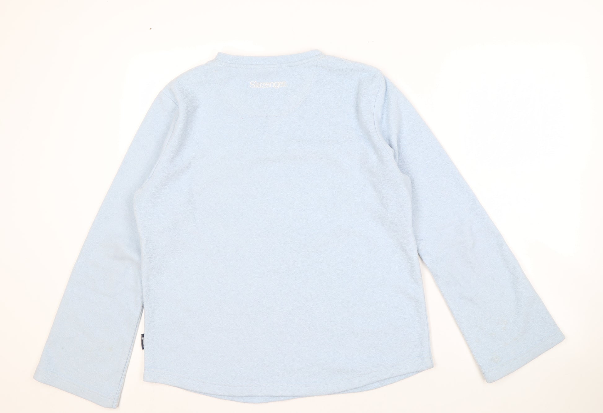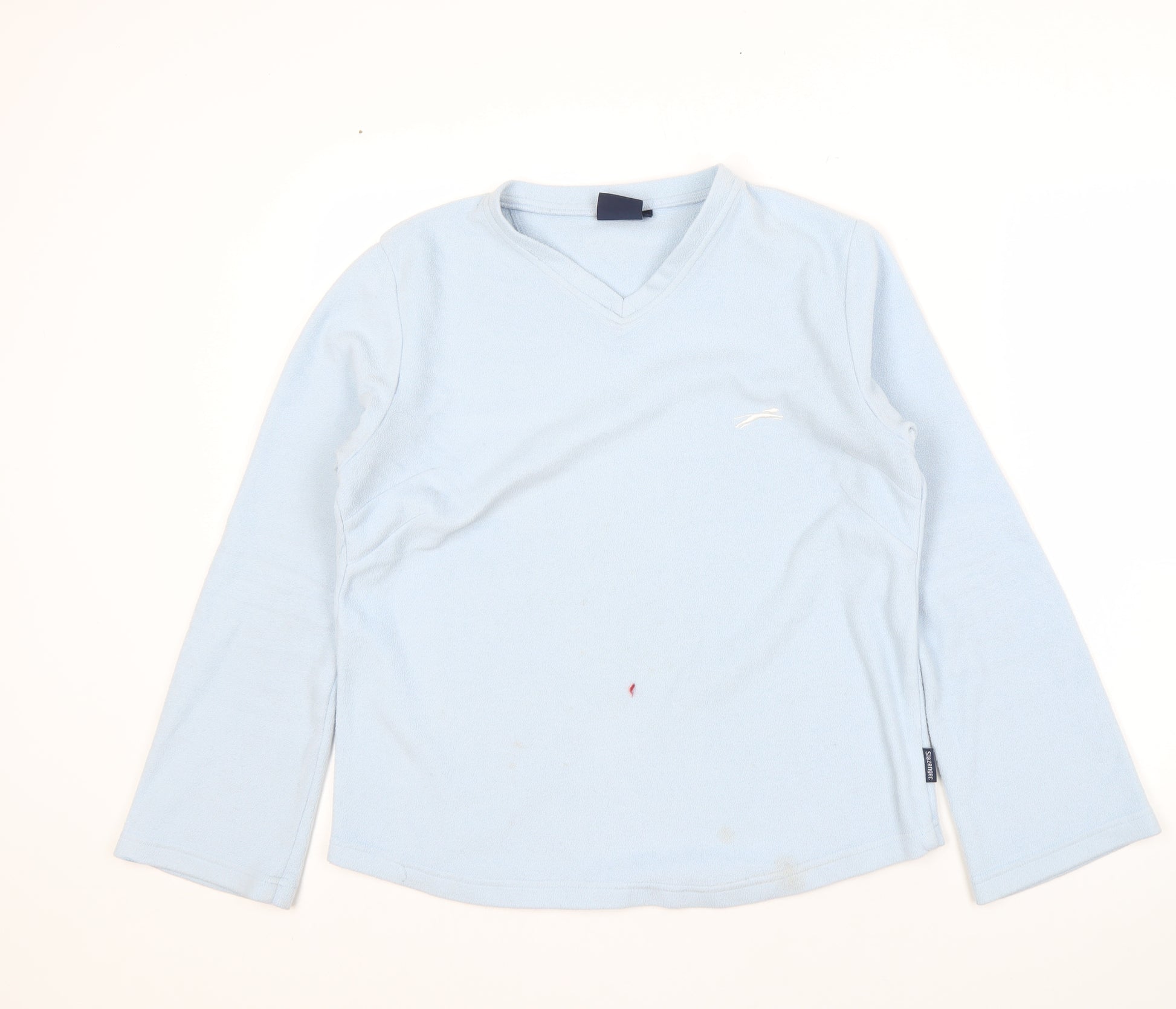 Embrace comfort and style with this Slazenger women's pullover sweatshirt. Crafted from soft blue fleece, this regular-fit top is perfect for casual wear during the cooler autumn and winter months. Designed with practicality in mind, it features a V-neckline and long sleeves, adding a touch of classic style to your everyday outfit. Made of 100% polyester, it offers durability and easy care, being machine washable for your convenience. A discreet logo accents the design, adding a hint of sportiness ideal for gym and training sessions. Despite showing some minor stains on the front, this sweatshirt remains in good condition and promises to be a warm and cozy addition to your wardrobe. Pair it with jeans or leggings for a laid-back look perfect for running errands or lounging at home.