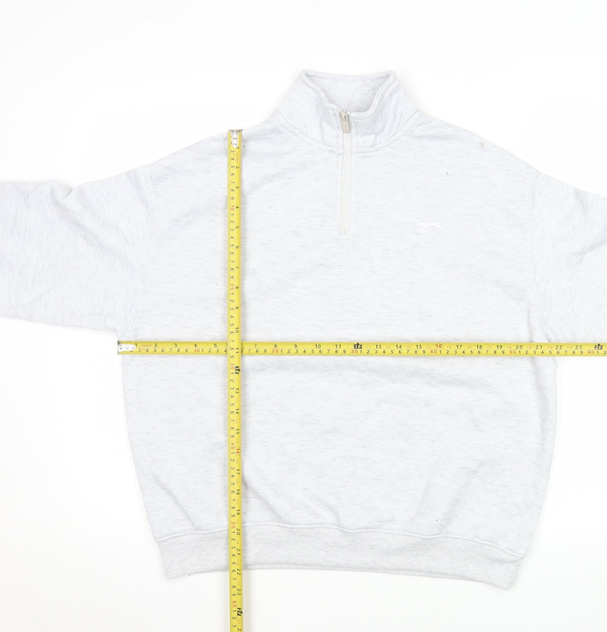 This Slazenger women's 1/2 zip pullover sweatshirt is designed for both comfort and casual style, making it a versatile addition to any wardrobe. Crafted from a soft, midweight blend of 65% polyester and 35% cotton, the fabric provides the ideal balance of breathability, warmth, and durability. The light grey colour gives this piece a clean, modern look that works well for leisurewear, sportswear, or layering in chilly weather. The high neck design adds extra warmth, while the half-zip front allows for adjustable ventilation, helping you stay comfortable during varying activity levels. This sweatshirt comes in a UK size 8 (XS), providing a regular fit suitable for women who prefer a neat, flattering outline without being restrictive. The long sleeves with comfortable ribbed cuffs and hem help retain warmth and shape over time. Its simple, logo-free finish—apart from the subtle Slazenger panther emblem—keeps the design classic and easy to style with joggers, leggings, or jeans.Ideal for casual outings, gym sessions, running errands, or light outdoor activities, this sweatshirt fits seamlessly into both active and relaxed lifestyles. The combination of premium polyester and cotton makes it machine washable and easy to care for, maintaining its shape and softness through repeated wear. While in excellent pre-owned condition, there is a minor mark near the shoulder, which does not detract from its overall quality or wearability.Perfect for cooler months, this pullover sweatshirt supports a sporty yet understated look that’s effortlessly comfortable for daily wear. Whether you're heading to the gym, walking the dog, or lounging at home, this Slazenger sweatshirt is a dependable essential that merges function with timeless casual appeal.