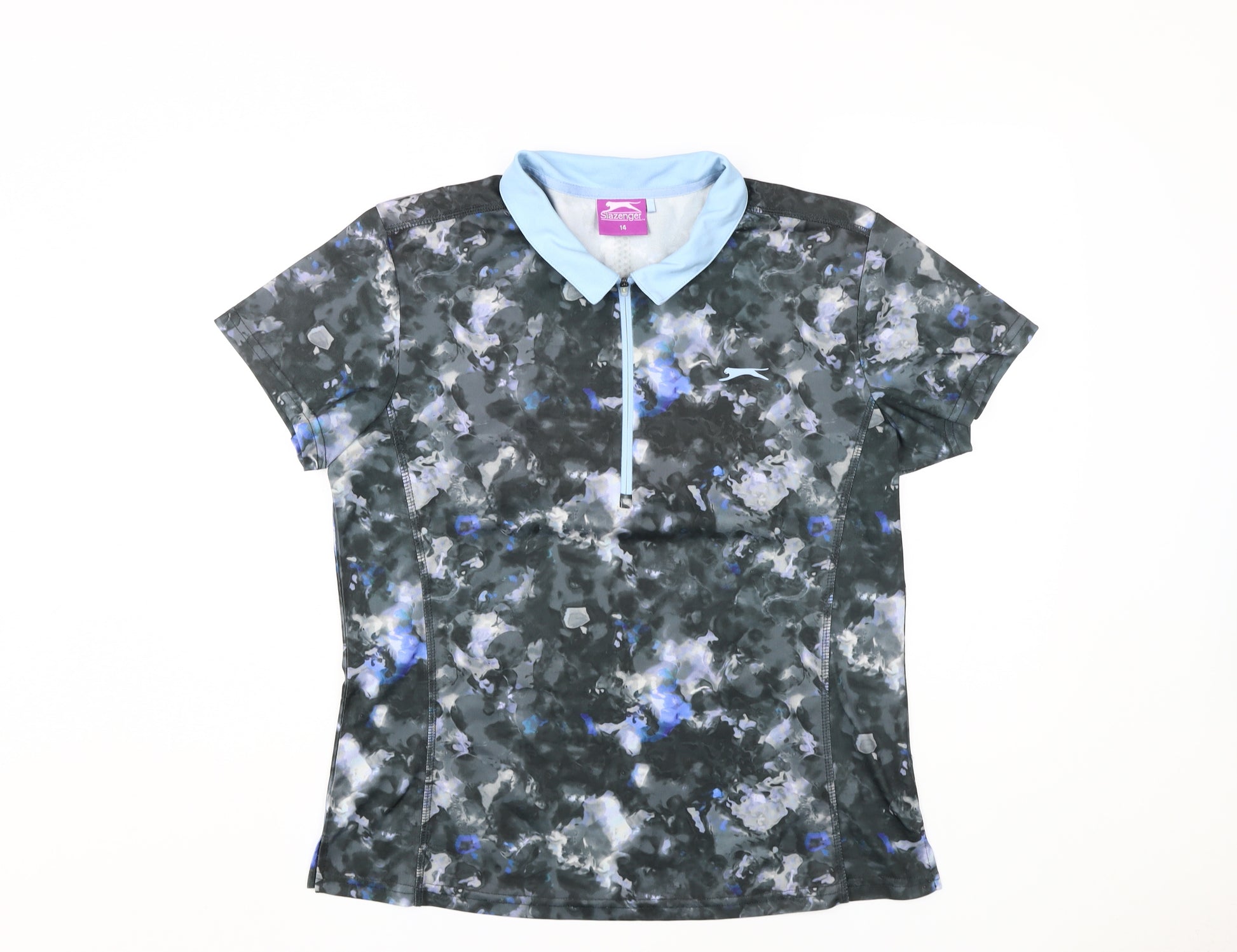 Add a splash of colour to your activewear collection with this Slazenger women's polo shirt. Perfect for golf or gym training, this shirt features a vibrant multicoloured geometric pattern, ensuring you stand out on any course or track. Designed with a 1/4 zip for easy adjustments and a classic collared neckline, it combines functionality and style seamlessly. The short sleeves are made for comfort and flexibility, keeping you cool and focused during a workout. Crafted from lightweight, moisture-wicking polyester, this polo is made to keep sweat at bay while providing excellent breathability. The shirt is machine washable, allowing easy and quick cleaning for the active woman on the go. Embrace the regular fit for a relaxed silhouette that enhances movement, essential for any sport. Although in an excellent used condition, it remains free from visible flaws or damage, making it an excellent addition to your wardrobe. With a jersey fabric type and a simple zip closure, this polo blends comfort and convenience in every wear. Whether for an intense game of golf or just a casual workout, this Slazenger polo shirt will definitely make a striking impression.