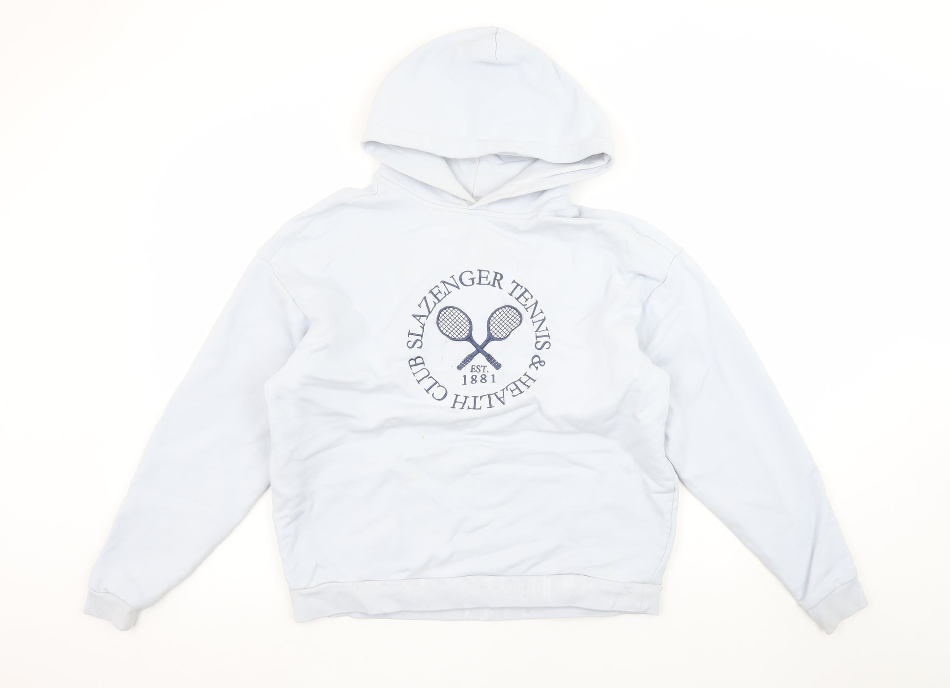 This Slazenger women's white pullover hoodie is a sporty and stylish choice that captures the timeless aesthetic of relaxed athleisure wear. Crafted from a soft fleece blend of cotton and polyester, it ensures a comfortable and breathable feel ideal for everyday casual use or light sporting activities. The hoodie features a classic pullover design with long sleeves, ribbed cuffs, and hem for a cozy, fitted look. The front of the hoodie showcases an embroidered Slazenger Tennis & Health Club motif with crossed racquets and 'Est. 1881' text, giving it a nostalgic nod to traditional sports heritage and adding a visually appealing graphic element.This hoodie comes in a UK size 8, providing a regular fit that flatters the figure while allowing comfortable movement. Made in Turkey, the quality construction and blend of 79% cotton and 21% polyester provide both softness and durability. The design includes a spacious hood for extra warmth, making it suitable for all seasons, particularly transitional weather in autumn and spring. The versatile white tone allows easy pairing with jeans, joggers, or leggings for a laid-back, fashionable ensemble. While there are some light stains on the front and sleeve, the overall garment remains in very good condition with minimal signs of wear.Ideal for tennis enthusiasts, gym sessions, or simply lounging in comfort, this Slazenger hoodie represents the perfect blend of sporty charm and comfort. It’s lightweight yet warm, making it suitable for both layering and standalone wear. Whether worn post-workout, for a casual day out, or while relaxing at home, this hoodie combines style and practicality effortlessly. Choose this timeless Slazenger piece for a relaxed, athletically inspired look that pays homage to tennis heritage and classic British design.