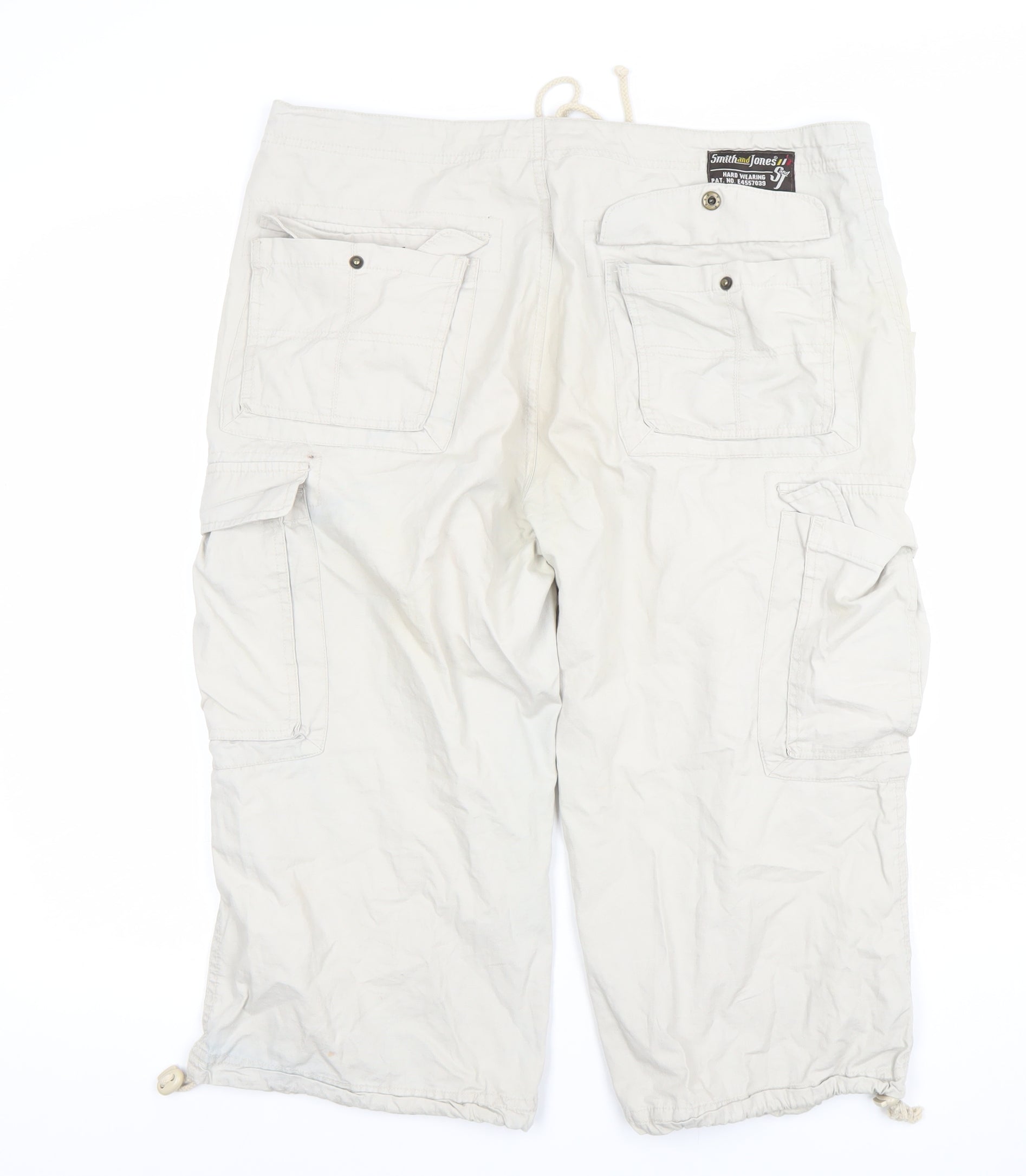 Discover easy, adventure-ready style with these Smith and Jones men's beige cargo shorts. Crafted entirely from soft, breathable 100% cotton fabric, these shorts deliver effortless comfort and long-lasting wear, perfect for spring and summer activities. The soft beige tone pairs effortlessly with a wide variety of tops and footwear, making these shorts a versatile addition to any casual wardrobe. Designed with practicality in mind, they feature multiple roomy cargo pockets and deep side slash pockets for convenient storage of small essentials while on the go. The relaxed, regular fit ensures everyday comfort, while the flat front and drawstring waist offer adjustable ease of movement. Complementing their outdoorsy cargo style, the lightweight material keeps you cool whether you're travelling, working outdoors, or simply enjoying relaxed weekends. Smith and Jones’ distinctive branding detail appears on the waistband and pocket, showcasing the brand’s focus on casual menswear with a rugged twist. Their light fabric wash enhances the laid-back aesthetic, perfect for pairing with tees, polos, or lightweight shirts. The drawstring waist and ankle toggle ties add both functional flexibility and an urban edge, ideal for those who appreciate both comfort and practical design. Durable and machine washable for easy care, these shorts are built to handle daily wear while maintaining their shape and quality. Suitable for men who value comfort, durability, and effortless casual style, these cargo shorts make a perfect choice for holidays, travel, or warm-weather outings. Their timeless look captures that off-duty appeal ideal for contemporary weekend dressing. In very good pre-owned condition with only light general wear, these Smith and Jones cargo shorts remain an excellent wardrobe staple ready for many more adventures ahead.