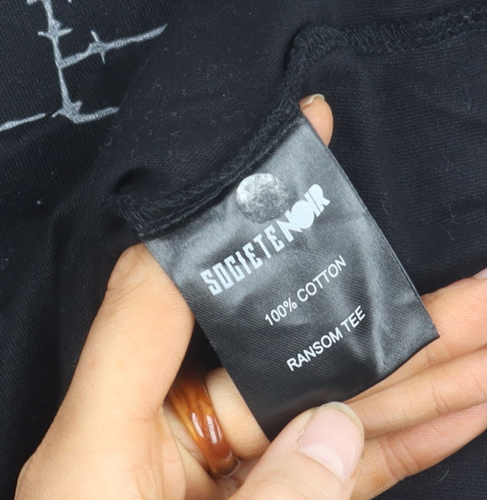Step into bold style with the Societe Noir Men's Black Cotton Graphic T-Shirt. This striking tee, crafted from 100% cotton, promises comfort and durability, making it an essential addition to your wardrobe. The shirt’s graphic print speaks volumes, combining edge and high fashion effortlessly. Designed in a classic black hue, this short sleeve tee is versatile and perfect for casual settings or nights out. Its crew neckline adds a timeless touch, while the regular fit offers a comfortable, sleek silhouette suited for every body type. Ideal for men looking to make a statement while maintaining comfort, this T-shirt serves as the perfect foundation for layering or as a standout piece on its own. Whether you're pairing it with jeans for a laid-back look or chinos for a refined appeal, this tee adapts seamlessly. Don't miss out on this stylish staple that embodies both trend and tradition. Perfect as a gift or for enhancing your own collection, it promises to elevate any ensemble with ease.
