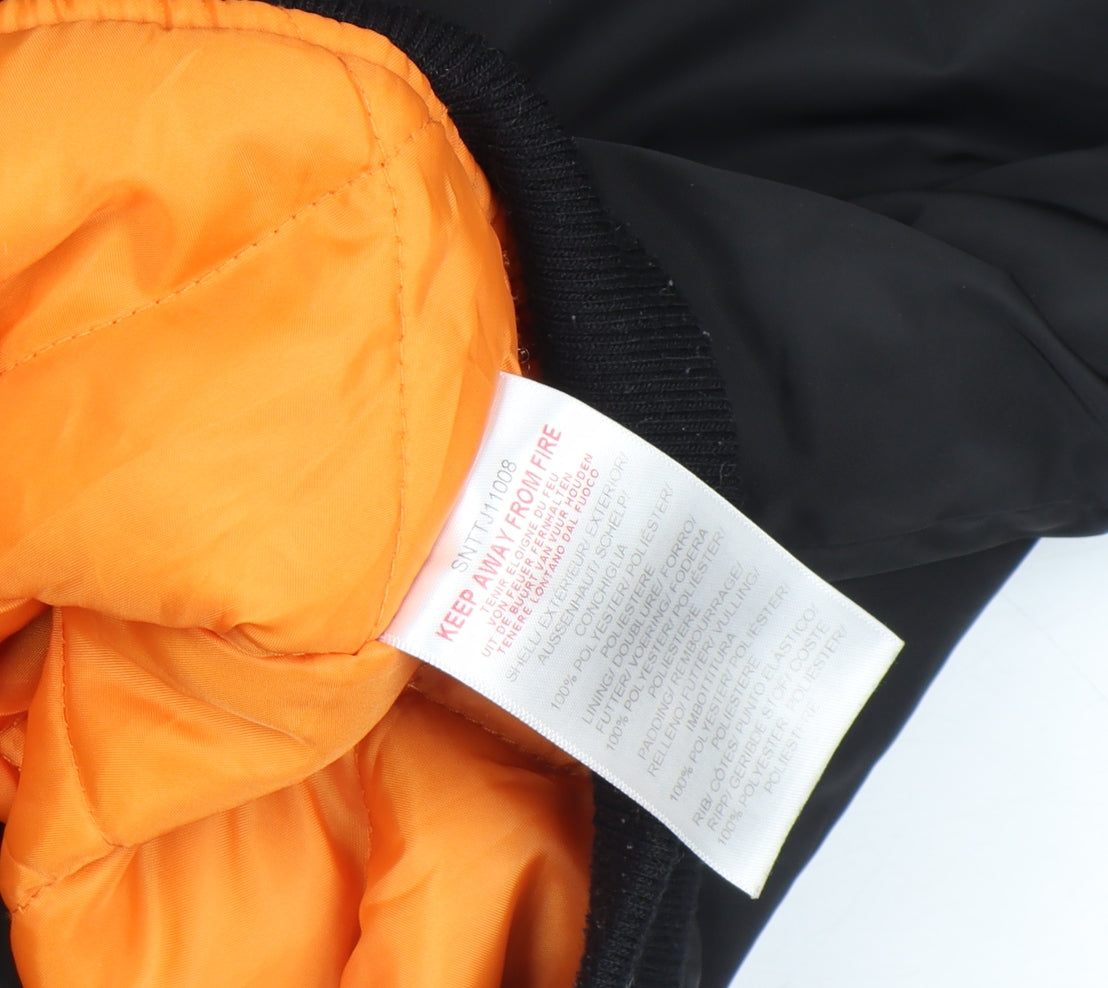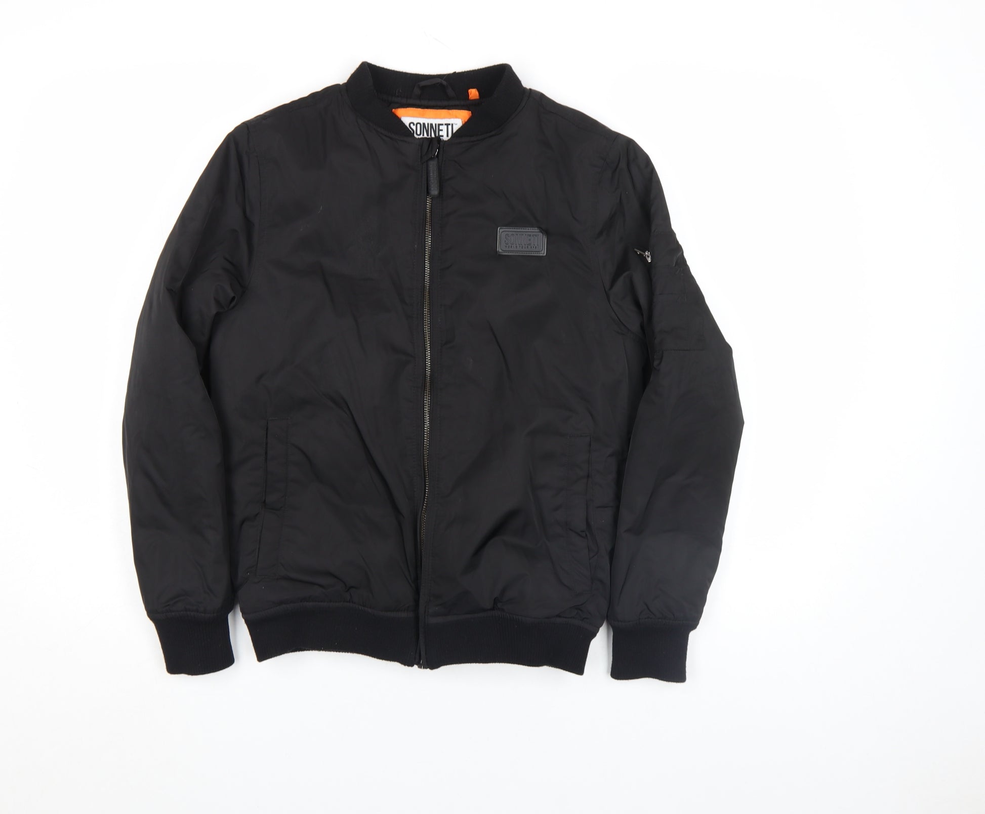 Keep your youngster warm and stylish with this Sonneti Boys Black Bomber Jacket, designed for both comfort and fashion through the cooler months. Crafted from durable polyester, this jacket features a sleek black outer shell complemented by an eye-catching orange lining, giving it a classic bomber aesthetic with a modern edge. The smooth woven polyester exterior is lightweight yet sturdy, perfect for layering during autumn and winter, while the polyester-filled lining ensures excellent insulation without feeling bulky.With a full front zip fastening and ribbed cuffs and hem, this bomber provides a snug fit that keeps out the chill. Two side pockets and an additional zip pocket on the sleeve add practicality and everyday convenience for carrying small essentials. The internal orange lining offers a bold pop of colour that contrasts beautifully against the black shell, maintaining the timeless Sonneti streetwear look. The subtle logo patch on the front completes the design with understated branding that every young trendsetter will appreciate.Ideal for school, weekends, and outdoor adventures, this jacket is versatile enough for casual outings while offering reliable warmth and comfort. The fabric is machine washable for easy care, making it perfectly suited to busy family life. This jacket is in excellent pre-owned condition, showing only minimal signs of wear and no damage or staining. The absence of original retail tags indicates it has been gently used but well-maintained.Whether paired with jeans and trainers for a laid-back urban look or layered over a hoodie for extra cosiness, this Sonneti bomber adds effortless cool to any outfit. A dependable, stylish choice for the modern boy, blending everyday practicality with standout design. Give your child comfort and confidence in this premium-quality jacket that’s built to look good season after season.