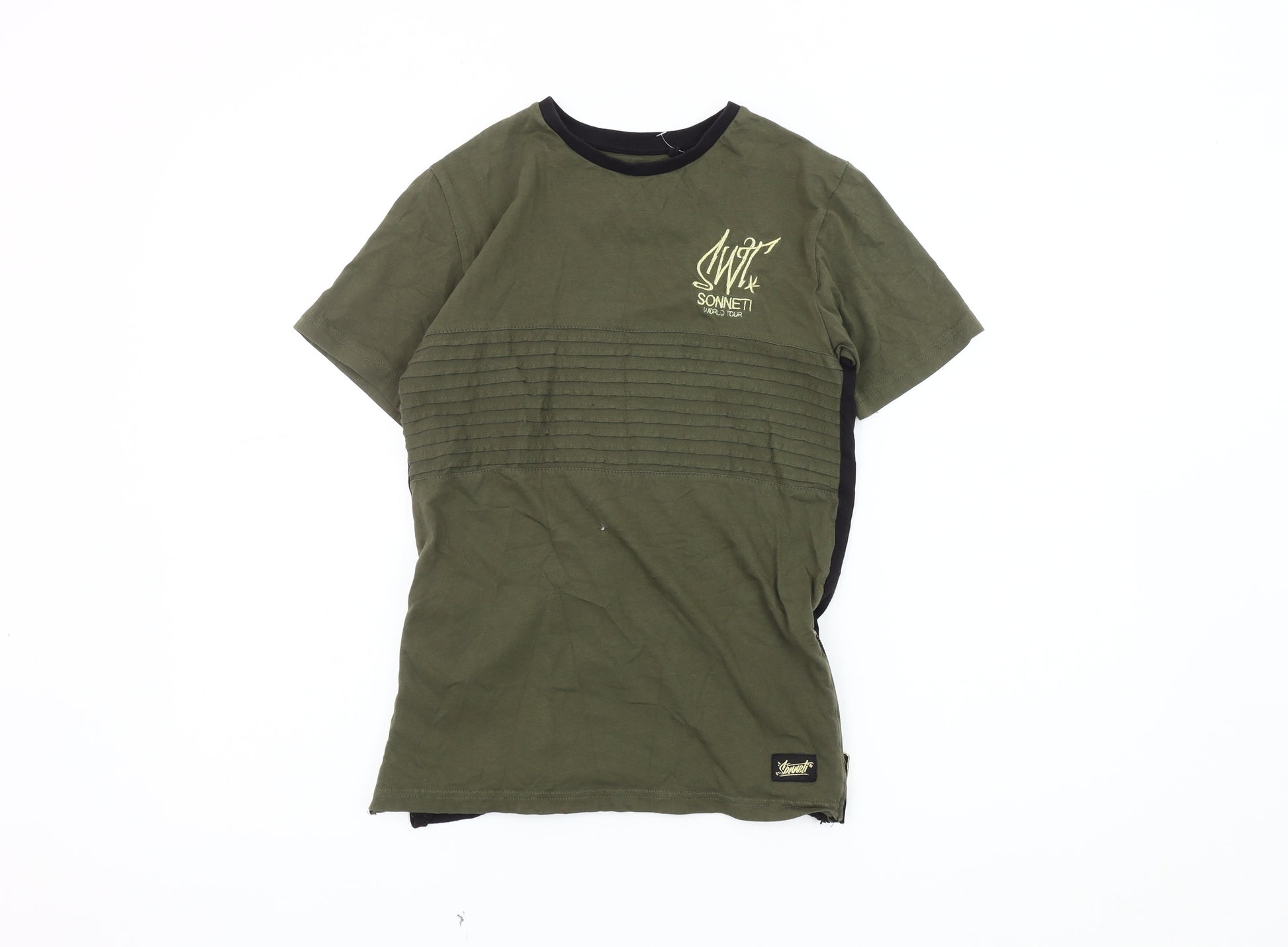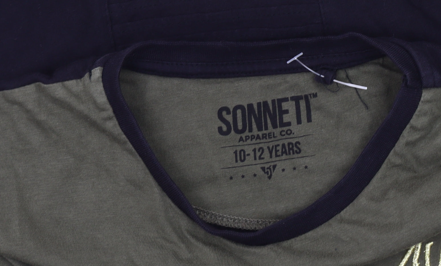 Embrace style and comfort with this Sonneti boys' T-shirt, ideal for versatile everyday wear. Boasting a striking green and black colour combination, this T-shirt is perfect for adding a touch of flair to any casual outfit. The short sleeves and relaxed fit ensure comfort on warm days, while the crew neckline offers a classic touch. Made from 100% cotton, it promises lightweight breathability and softness that will keep you feeling your best all day long. Accented with a stylish logo and convenient zip, it effortlessly combines functionality and fashion. Whether paired with jeans or shorts, this T-shirt makes a fantastic addition to any young boy's wardrobe. Ideal for all seasons, it caters to the active lifestyle of today’s youth with easy machine-wash care. Elevate your child’s style with this contemporary piece that's perfect for casual outings or simply lounging at home. With an excellent condition rating and no visible tags, you can be assured of its quality and authenticity.