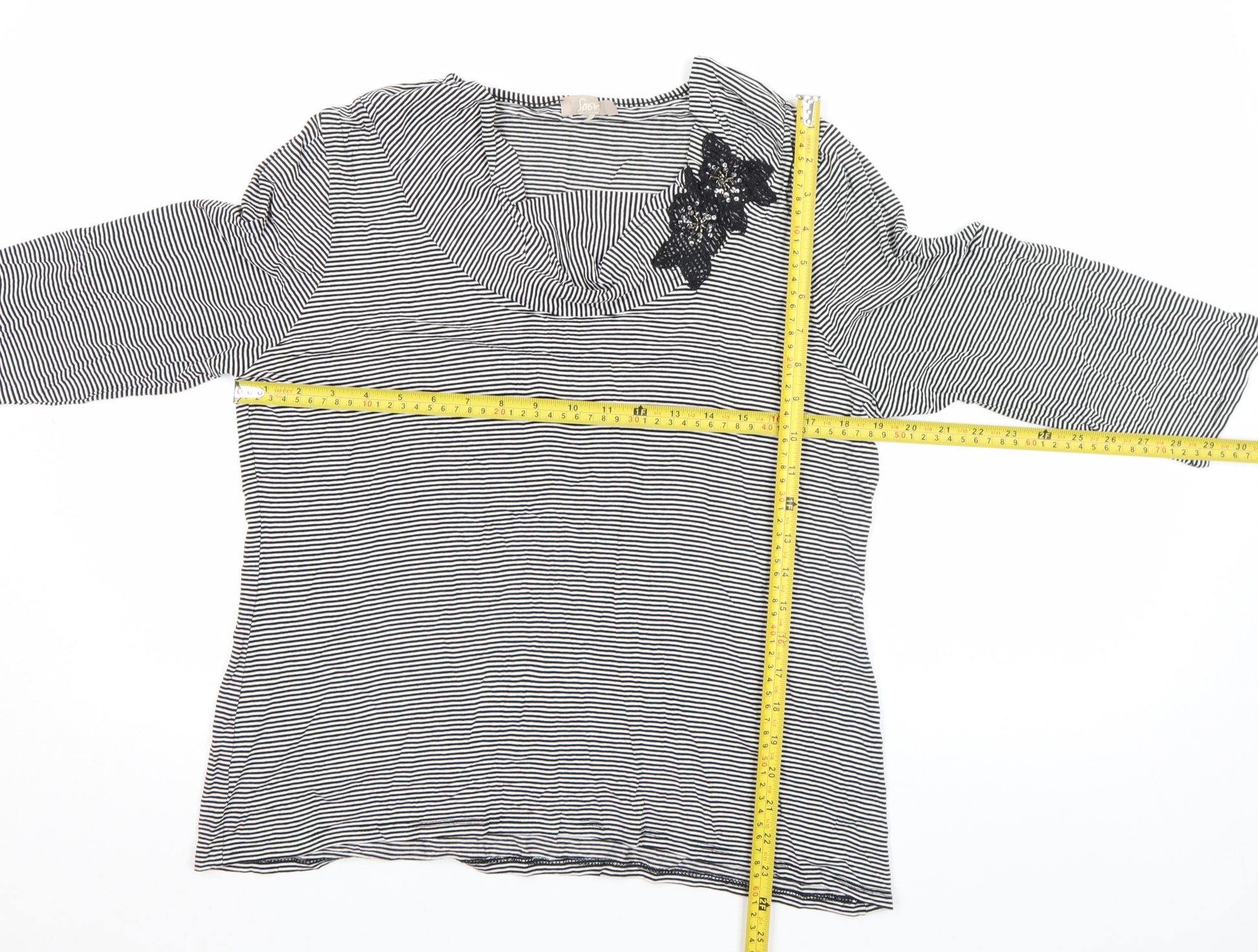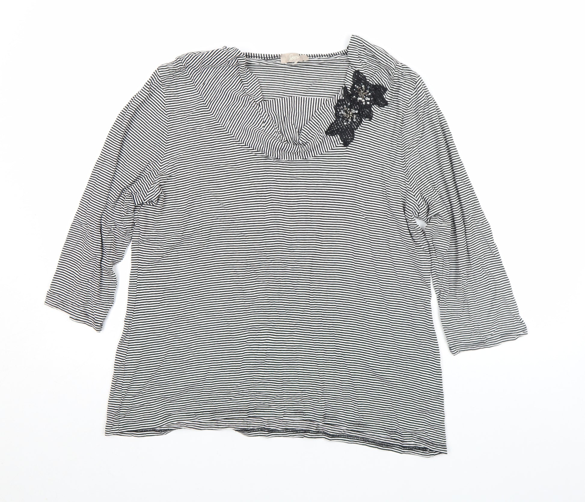 Add a touch of casual elegance to your everyday wardrobe with this lovely women's black and white striped top by Soon. Crafted from a soft jersey fabric blend of 97% viscose and 3% elastane, this top offers a lightweight, breathable feel with just the right amount of stretch for a comfortable fit. Perfect for transitional seasons, it features a stylish cowl neckline that drapes beautifully, while the three-quarter sleeves make it ideal for layering or wearing on its own. The striped pattern gives it a timeless look that is effortlessly flattering. A delicate embroidered black floral accent on the shoulder adds a feminine touch, making this top stand out from the ordinary. The regular fit ensures relaxed comfort without compromising on style, suitable for casual outings, shopping trips, or laid-back office wear. Designed with practicality in mind, the fabric is machine washable, ensuring easy care and long-lasting wear. This Soon jersey top pairs perfectly with jeans, tailored trousers, or a skirt for a range of looks that go from day to evening with ease. Though pre-loved, the garment remains in very good condition with only minimal evidence of use and no visible flaws. Refresh your style with this versatile wardrobe staple that combines comfort and charm effortlessly. Ideal for women who appreciate classic patterns with a contemporary twist, this top is a simple yet chic addition to any collection. Whether you're dressing for a relaxed weekend look or casual office wear, this piece by Soon brings understated sophistication and comfort to every outfit.