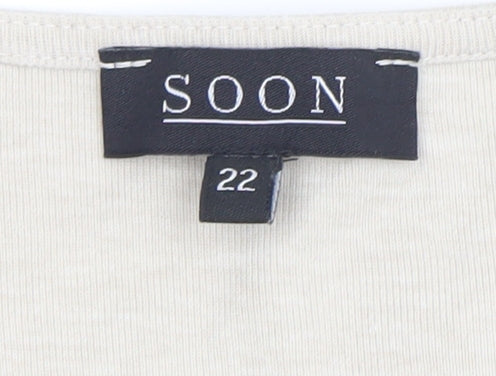 Add a touch of effortless charm to your wardrobe with this lovely beige floral top from SOON. Designed for women, this stylish T-shirt offers a relaxed and comfortable fit in size 22, perfect for casual outings, weekend wear, or laid-back days at home. The soft jersey fabric blend of cotton and polyester feels smooth against the skin while offering a lightweight, breathable feel suitable for warmer months. Its beautiful floral pattern in shades of blue and violet adds a fresh, feminine flair that stands out against the neutral beige background. Featuring a flattering scoop neckline and 3/4 fitted sleeves, this top is both versatile and easy to style. The pullover design ensures convenience, while the classic cut makes it a timeless piece you can pair with jeans, skirts, or shorts. Ideal for spring and summer wear, the combination of natural and synthetic fibres offers durability with a comfortable stretch that maintains shape and softness wash after wash. The jersey fabric drapes nicely and complements a variety of body types, while the flower print adds a touch of nature-inspired elegance. Whether you’re dressing up for a casual lunch or keeping it simple for everyday wear, this SOON women's floral T-shirt makes an excellent addition to any outfit. Machine washable for easy care, this gently used piece remains in excellent condition with no visible flaws or damage. A perfect blend of comfort, style, and practicality, it delivers timeless appeal and versatile charm at a great value.