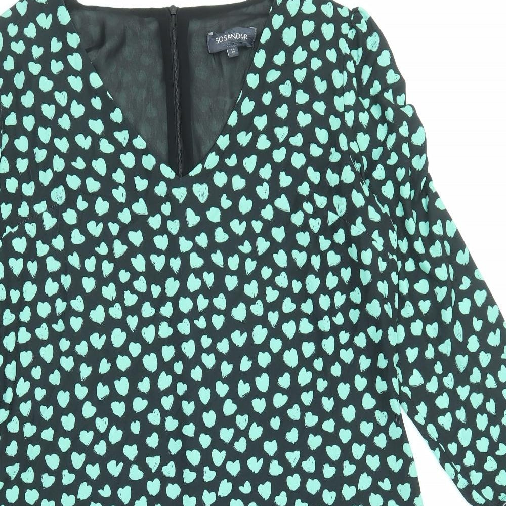 Womens Black Geometric Polyester A-Line Size 12 V-Neck Zip - Heart pattern