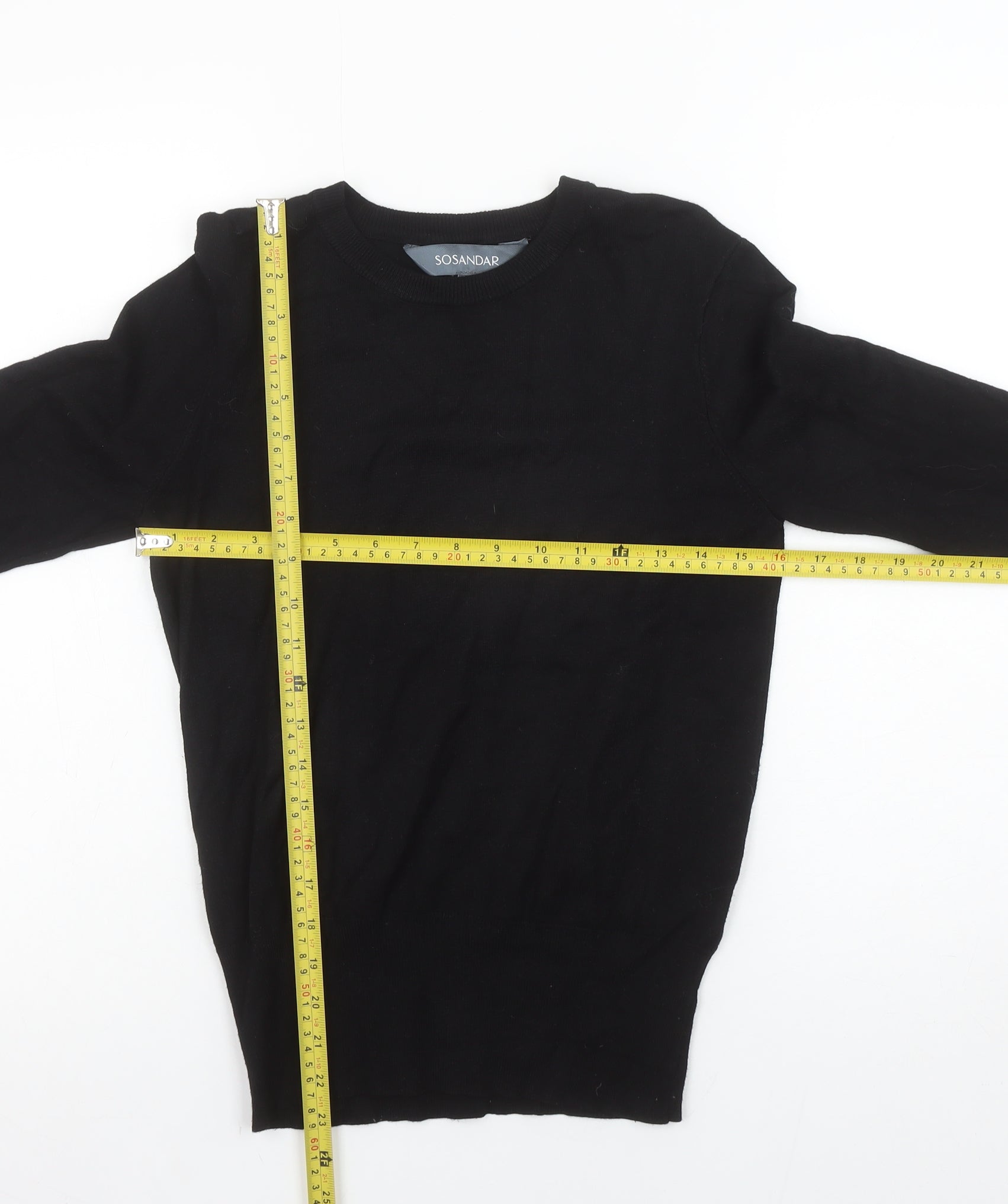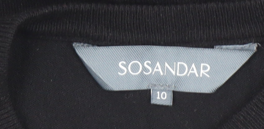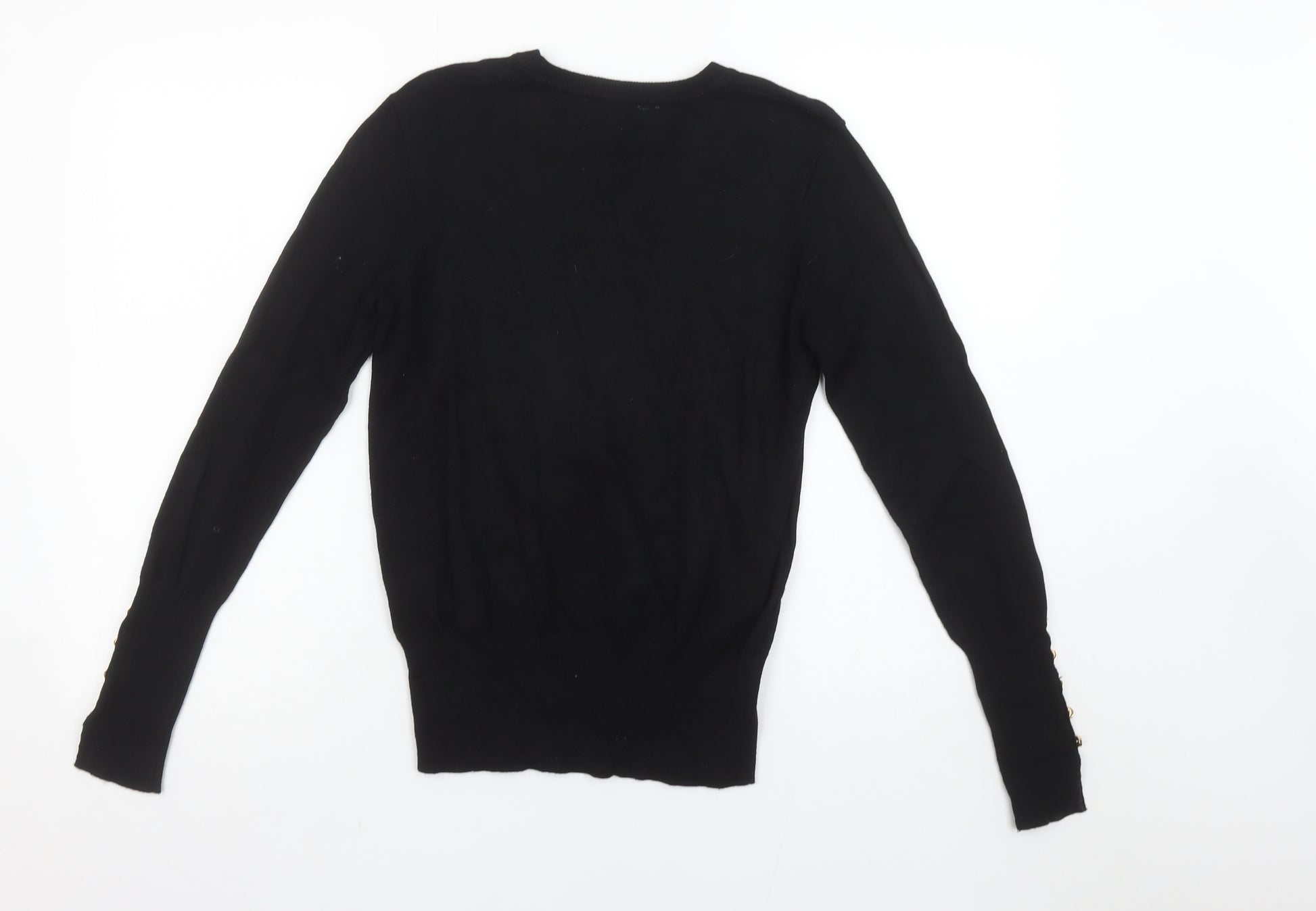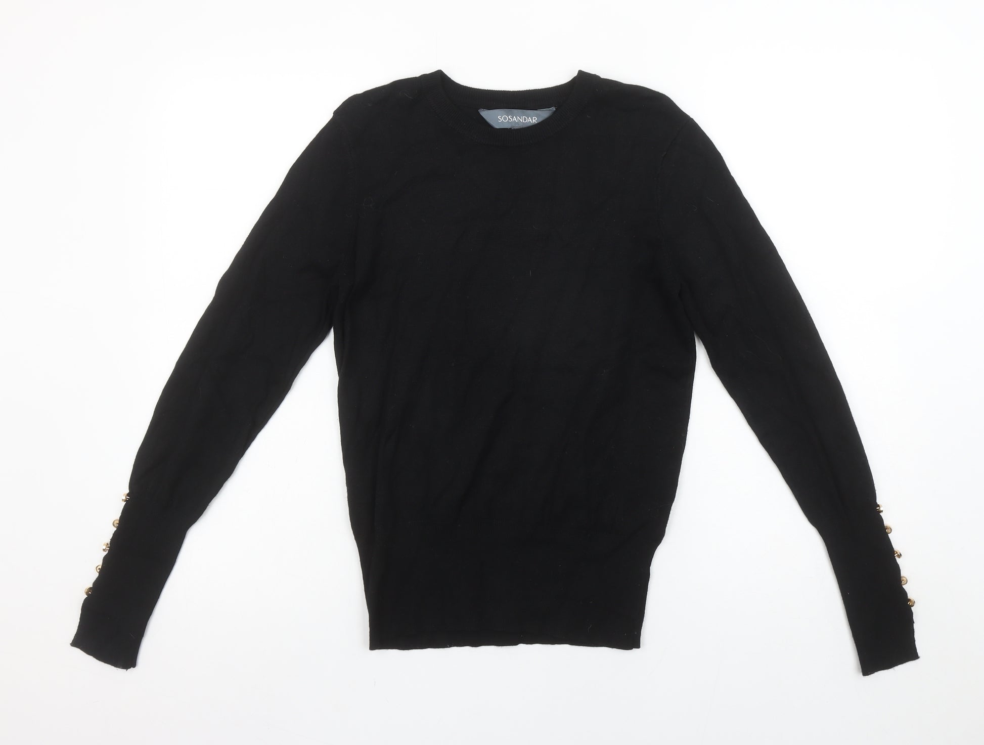 Elevate your seasonal wardrobe with this stylish Sosandar women's black jumper, designed to blend everyday comfort with understated sophistication. Crafted from a soft knit composed of viscose and polyamide, this pullover offers a lightweight and breathable feel that is perfect for transitioning between cool and mild seasons. The fabric drapes smoothly for a flattering silhouette while maintaining excellent durability and shape retention, making it an effortless go-to piece for any occasion. This crew neck jumper features long sleeves finished with subtle decorative buttons, adding a touch of texture and refined detailing to a versatile design. Its tightly knit fabric ensures warmth without bulk, while the sleek black hue provides limitless styling options — effortlessly complementing trousers, jeans or skirts. Whether worn under a blazer for an office-ready ensemble or paired casually with denim, this jumper strikes the right balance between polished and relaxed. Designed in a regular fit for comfortable wear, the Sosandar black jumper suits a variety of occasions from everyday casual to business casual settings, making it a highly versatile addition to your wardrobe. The quality viscose blend ensures a smooth, soft finish against the skin and resistance to creasing for an elegant, low-maintenance wear experience. Machine washable for easy care, this jumper embodies both practicality and understated style. Perfect for layering when temperatures drop, it transitions seamlessly through autumn, winter, and into early spring. Lightly pre-loved but still in excellent condition, this piece shows minimal signs of previous wear with no visible damage or imperfections, ensuring you receive both quality and style at a fantastic value. Ideal for anyone seeking a timeless, comfortable knit essential that pairs with almost anything in your closet.