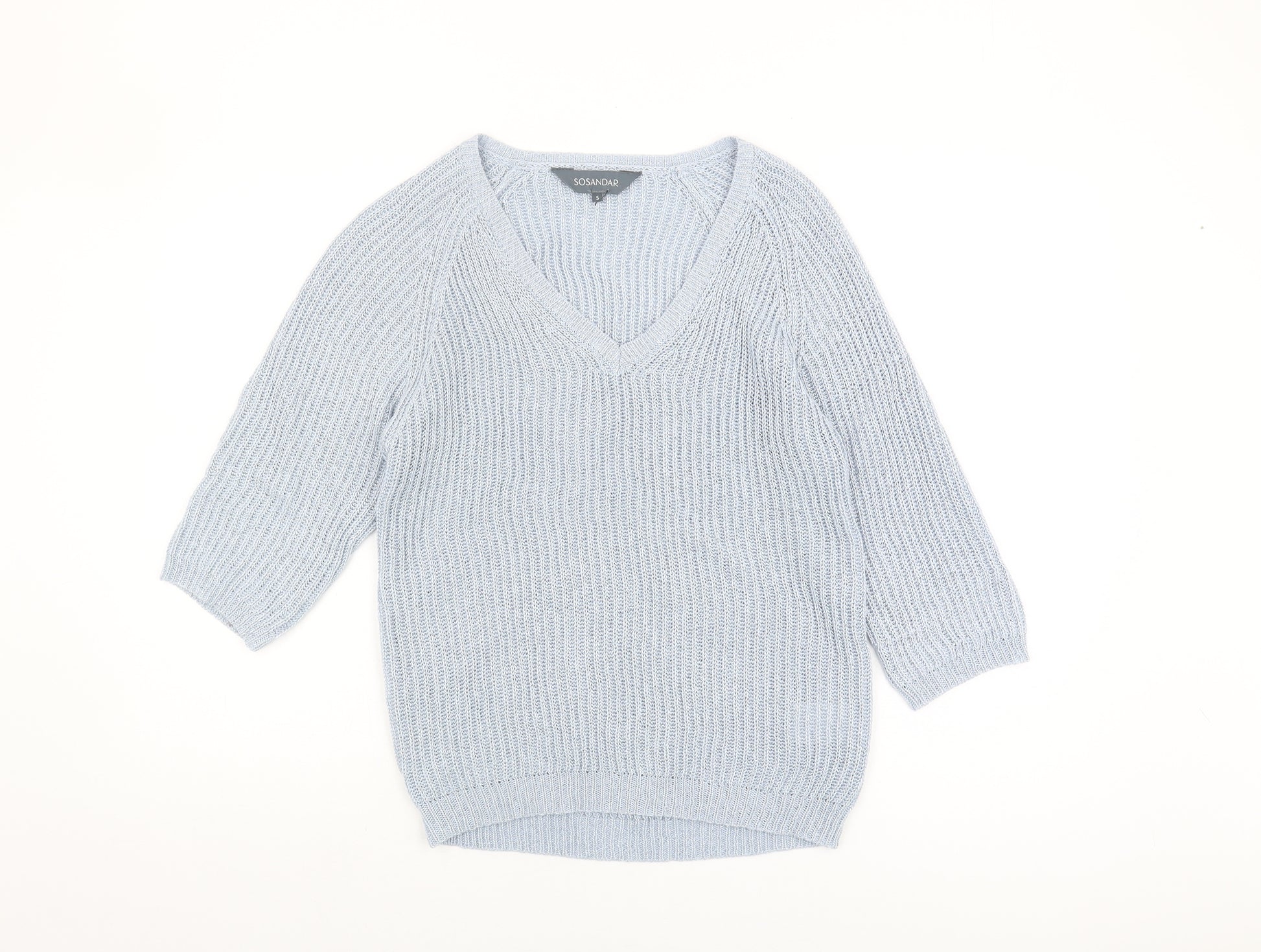 Discover the ultimate comfort of this Sosandar Women's Jumper. Designed in a refreshing blue colour, this pullover is crafted to offer style and elegance for every occasion. It features a flattering V-neckline and a 3/4 sleeve that exudes a casual yet chic vibe, making it perfect for your spring wardrobe. Made from a quality blend of materials including acrylic, nylon, polyester, and metallic fiber, this knit jumper ensures warmth without compromising on style. The open-knit pattern adds texture, creating a sophisticated visual appeal. Its raglan sleeves provide a relaxed fit, offering both comfort and a standout look. Ideal for casual settings, this Sosandar jumper seamlessly combines practicality with fashion. Pair it with your favourite jeans or trousers for a versatile outfit that will keep you looking effortlessly stylish. Embrace the perfect blend of comfort and sophistication with this wardrobe essential.