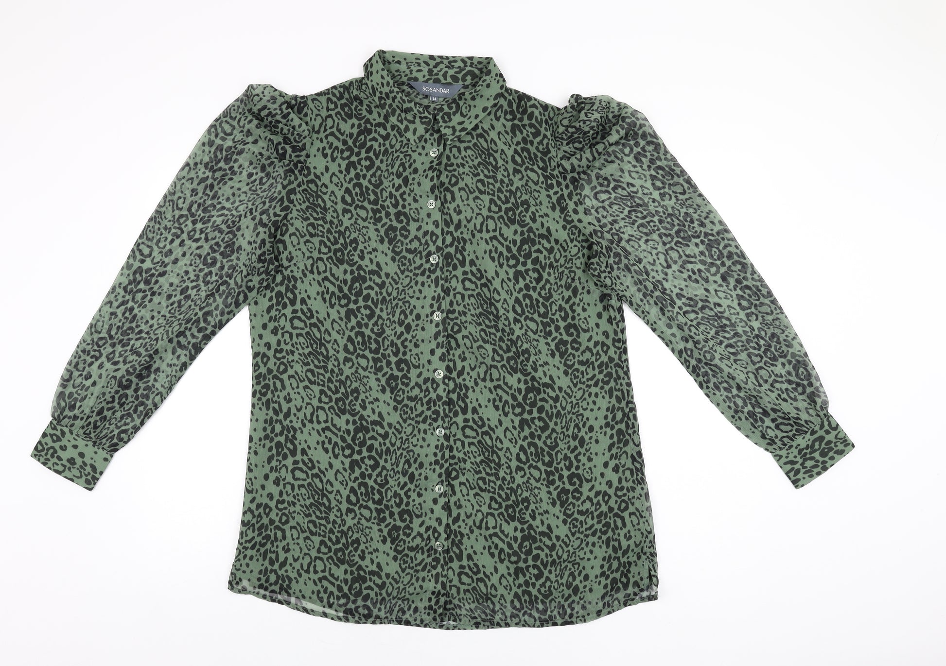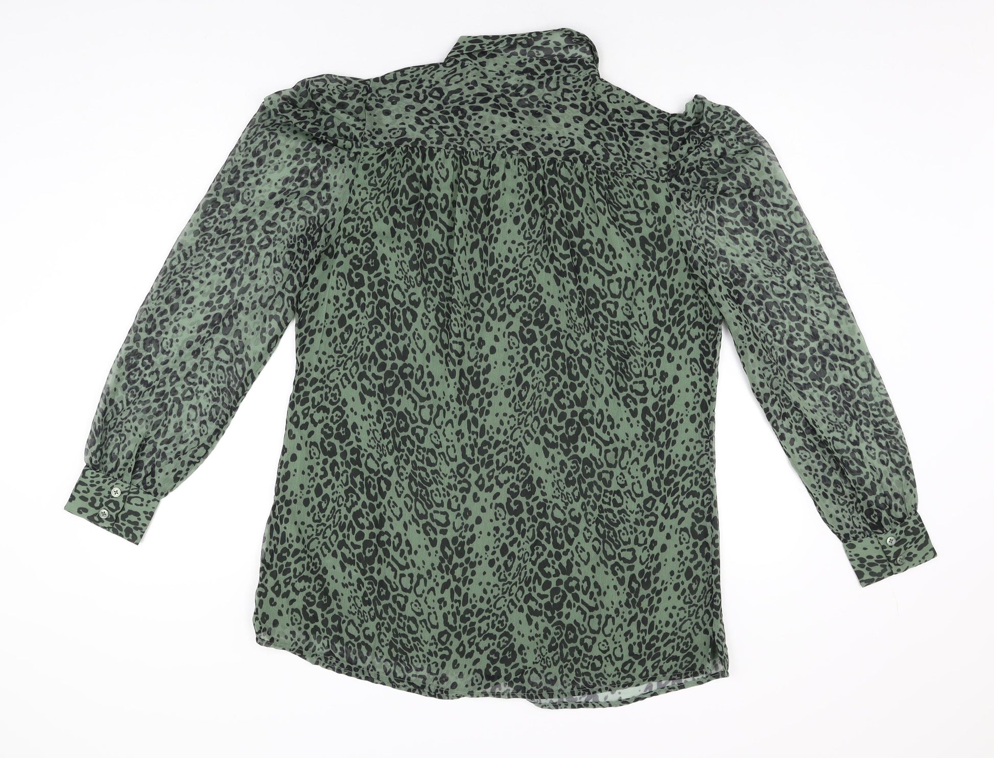 Womens Green Animal Print Polyester Basic Button-Up Size 14 Collared