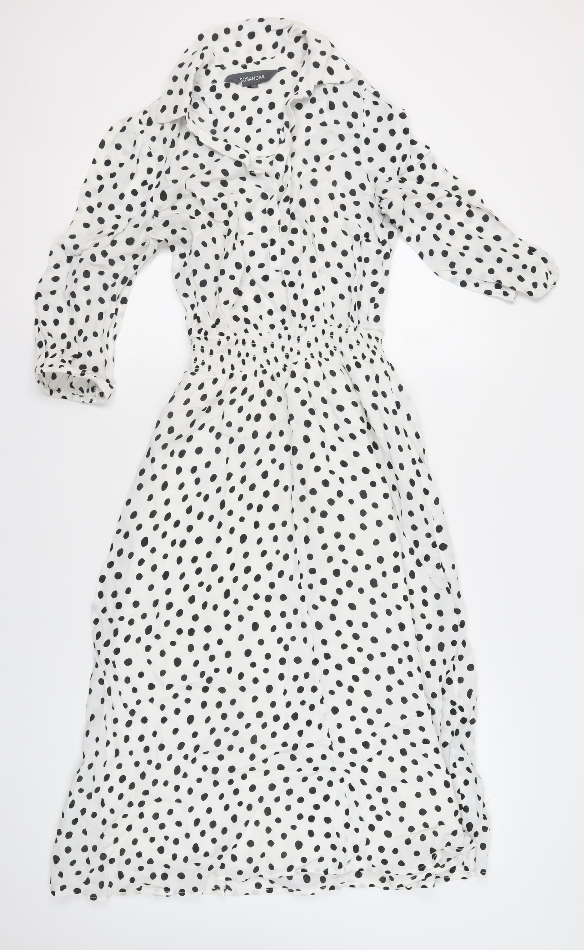 Step out in style with this elegant SOSANDAR White Polka Dot Midi Dress, featuring a sophisticated classic polka dot pattern. Designed for women, this dress is perfect for those who love a blend of vintage charm and modern flair. The collared neckline adds a touch of formality, making it versatile enough to dress up or down. Long sleeves ensure comfort no matter the season. Crafted from 100% viscose, this dress offers a beautifully soft and lightweight feel, perfect for casual outings or more formal events. The regular fit guarantees ease of movement while maintaining an elegant silhouette. Ideal for fashion-forward women, this midi dress is a great addition to any wardrobe. Priced attractively for a touch of luxury without breaking the bank. Don't miss the chance to add this timeless piece to your collection!