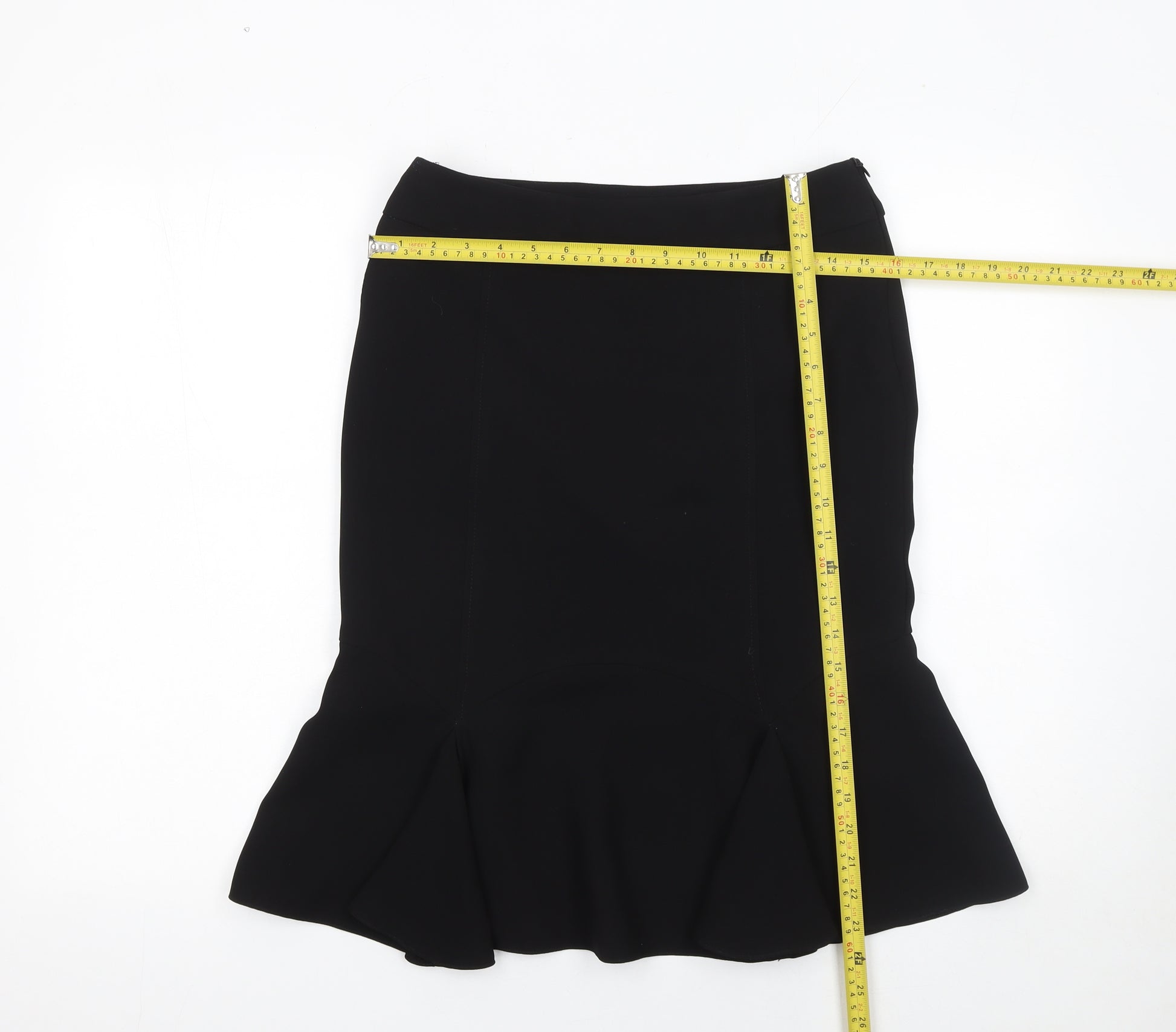 Step out in confidence and sophistication with this stunning black trumpet skirt from South. Designed in a classic, versatile black, this knee-length skirt gives an elegant silhouette with its beautifully flared hemline. Crafted from 100% polyester, it offers a structured yet comfortable fit that seamlessly transitions from day to evening occasions. The medium rise waistband flatters the natural waist, and the practical zip closure ensures a secure and smooth finish. The skirt’s lined interior adds a layer of comfort and quality, perfect for busy days at the office as well as polished evening events. Its timeless style and minimalist design make it a wardrobe essential that can be dressed up with a blouse and heels for formal settings or styled with a knit top and ankle boots for a more casual approach. Suitable for business, formal, and workwear occasions, this piece radiates understated elegance. Carefully made in Bulgaria, it demonstrates refined tailoring and durability. Whether worn for professional meetings or sophisticated social events, the South black knee-length trumpet skirt is the ultimate piece for women who love smart, feminine style. In excellent pre-loved condition with no visible signs of damage, it’s a fantastic addition to your fashion rotation, blending comfort, class, and versatility in one chic garment. This timeless skirt will quickly become one of those trusted staples you reach for time and again, offering effortless pairing potential and ageless appeal. A must-have addition to any modern wardrobe.