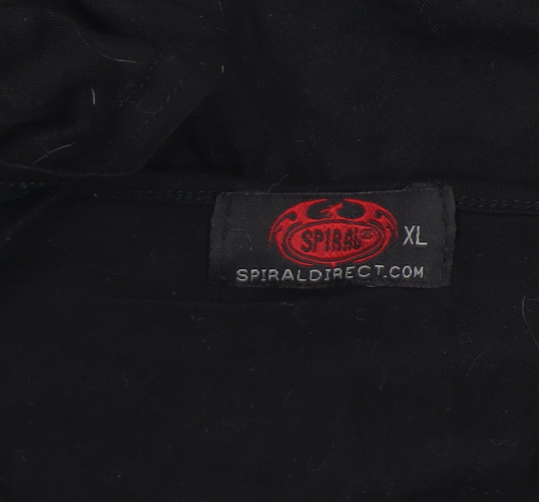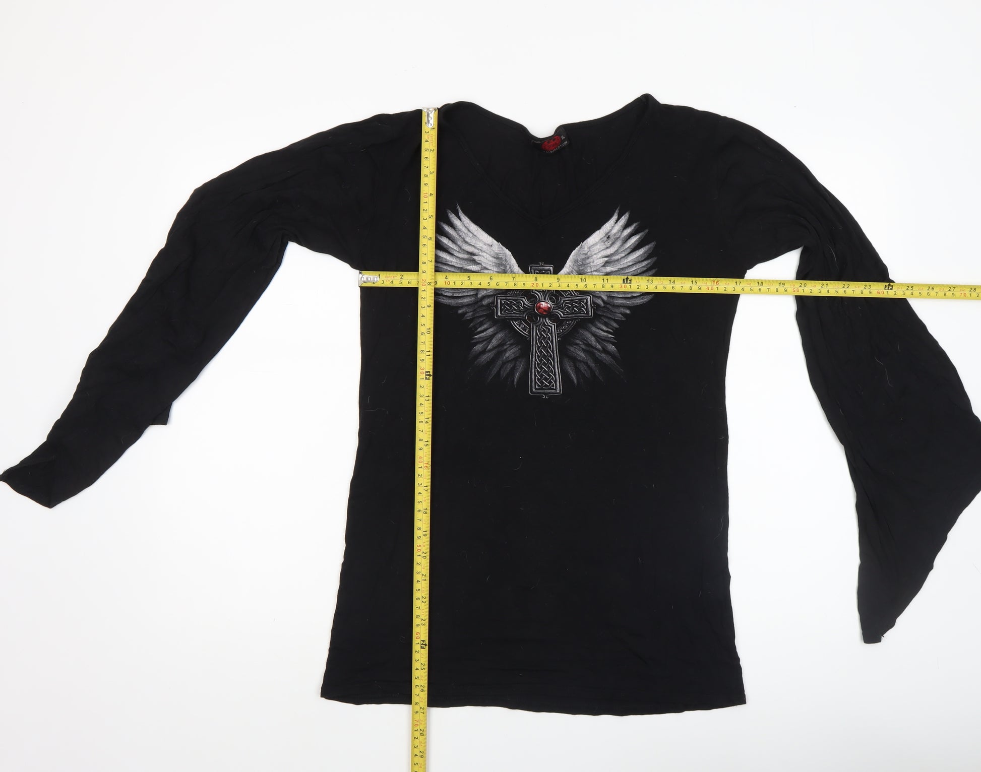 Elevate your alternative wardrobe with this striking Spiral Direct women's Gothic top in size XL. Crafted from a soft and flexible blend of viscose and elastane, the fabric feels smooth and lightweight against the skin, offering a flattering and comfortable fit that moves with you. This long sleeve tunic-style shirt features dramatic flared sleeves and a distinctive V-neckline that adds a stylish edge. The front showcases Spiral Direct’s signature gothic-inspired artwork — an intricate embroidered cross with angel wings and a red jewel-style accent, embodying the brand's darkly artistic aesthetic. Designed in a solid black jersey fabric, the top provides both comfort and bold style, perfect for layering or standing out on its own. Ideal for casual wear, parties, gigs, or showcasing your alternative style, this piece combines a comfortable fit with visually captivating detail. Made in the UK, it reflects quality craftsmanship and distinctive character. With its easy-care, machine-washable composition of 88% viscose and 12% elastane, it’s effortless to maintain while keeping its shape and appeal. The top is in excellent pre-owned condition, showing minimal signs of wear and no damage. This item is ideal for those who love gothic, rock, or angel-inspired fashion and want a versatile piece that works for multiple occasions across seasons. Pair it with jeans, a leather jacket, or layered accessories for a complete dark fashion look that’s distinctively Spiral Direct. A beautiful statement top that merges artistry and comfort perfectly, making it a standout piece for any wardrobe.