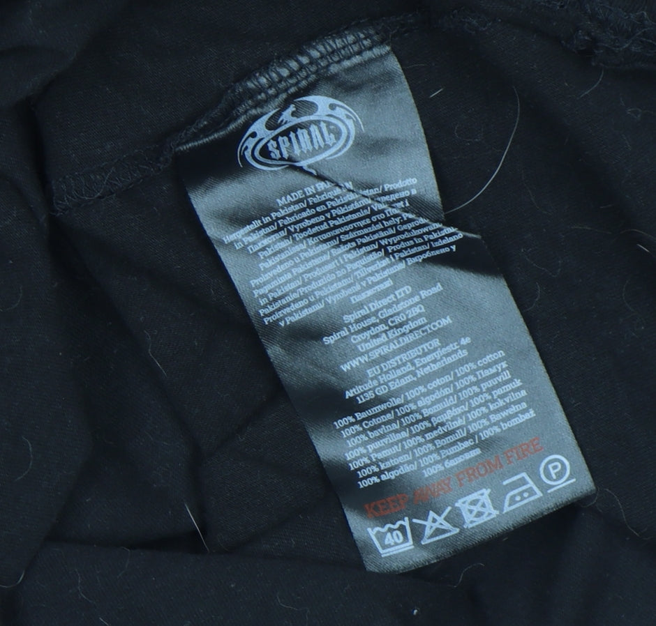 Step back into the 1980s with this striking Spiral Gremlins men's T‑shirt, featuring the beloved character Gizmo from the cult-classic movie. Crafted from 100% cotton jersey fabric, this lightweight and breathable tee offers soft comfort suitable for all seasons. Designed in timeless black, it carries a bold graphic print across the chest that’s instantly recognisable to fans of the film franchise. The crew neckline, short sleeves, and regular fit give this T‑shirt a classic casual look, perfect for everyday wear, relaxed evenings, or pairing with jeans for a nostalgic statement outfit. The vintage appeal of the Gremlins artwork pairs perfectly with the signature dark movie-style aesthetic that Spiral is known for. Easy to care for and machine washable, this T‑shirt combines practicality with retro pop culture charm. Whether you’re a collector of film memorabilia, a fan of iconic 80s cinema, or someone who appreciates quality printed tees with personality, this piece makes a superb addition to your wardrobe. Despite some light signs of wear typical of pre‑owned vintage apparel, the fabric and print remain in great condition. This authentic Gremlins T‑shirt will make an excellent gift or collector’s piece for anyone with a love for nostalgic movie merchandise or gothic-inspired fashion. Embrace retro style and relive the magic of an era with this unique Spiral Gremlins design — comfortable, stylish, and full of character. Available in size L, ideal for modern casual looks and comfortable all-day wear.