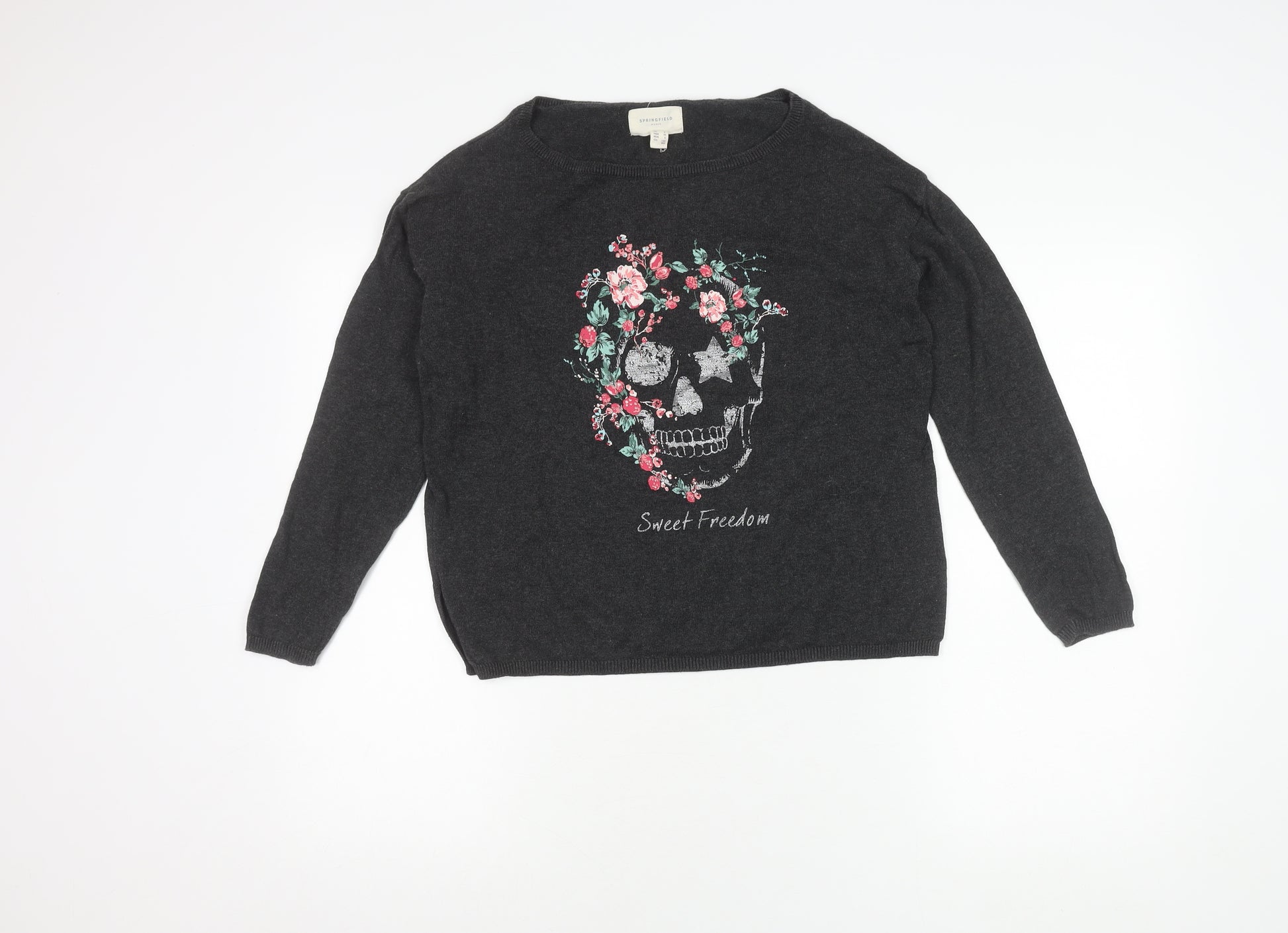 Elevate your casual wardrobe with the Springfield Women's Black Pullover Jumper. This stylish piece features an intricate floral skull embroidery, offering a unique blend of edgy and elegant. Crafted in a comfortable knit fabric, the jumper is ideal for layering or wearing on its own. With a boat neckline and long sleeves, this pullover maintains a refined silhouette suitable for various casual occasions. Its versatile black colour ensures it pairs effortlessly with your favourite jeans or skirts. Ideal for the fashion-forward woman who appreciates unique design accents, this jumper will be a standout addition to your collection.