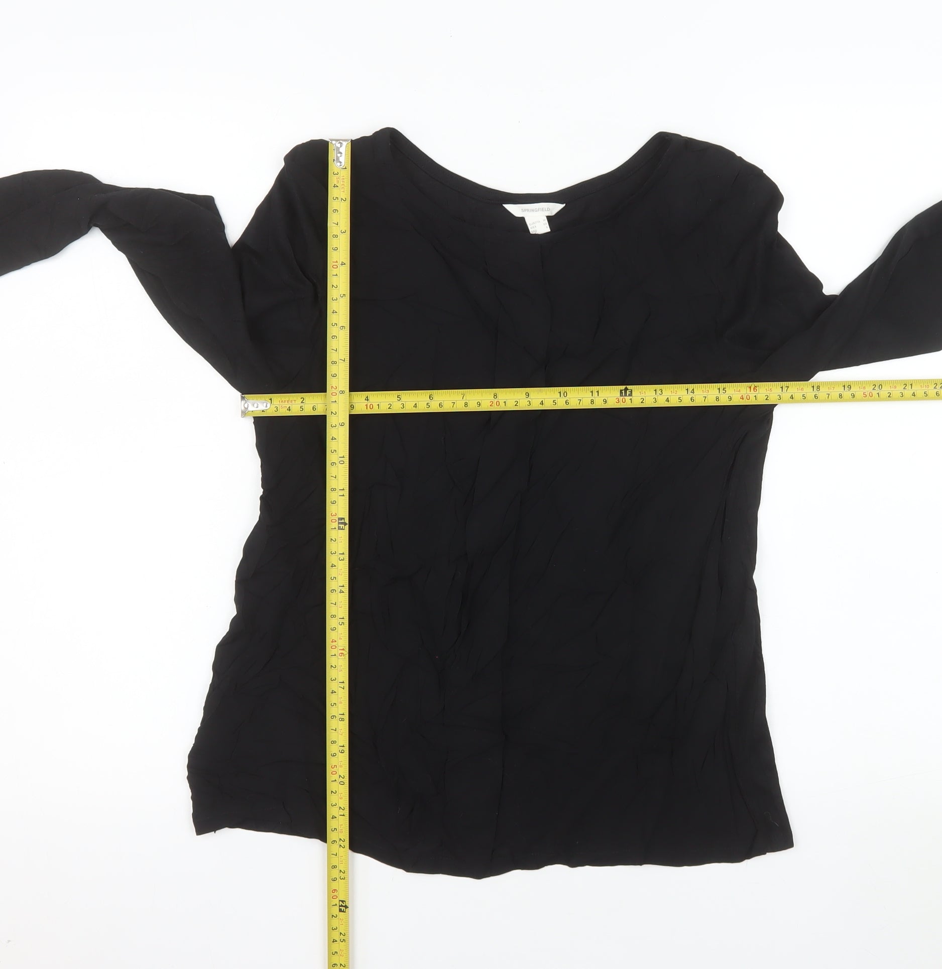 Elevate your everyday wardrobe with this stylish black long sleeve blouse from Springfield, designed with comfort and effortless versatility in mind. Crafted from soft and breathable 100% viscose fabric, this top drapes beautifully for a flattering silhouette that moves with you throughout the day. The understated crew neckline and long fitted sleeves offer a timeless look, ideal for layering under blazers or pairing with jeans and skirts alike. Its lightweight woven composition makes it perfect for transitional seasons such as autumn, spring, or even mild winter days. The pullover style ensures an easy fit, while the smooth fabric adds a touch of effortless sophistication to both casual and workwear outfits. Whether you’re dressing up for the office or styling it for weekend outings, this black blouse is a reliable essential that blends simplicity and elegance. Designed for women who value both comfort and style, it provides excellent versatility as you mix and match across your seasonal wardrobe. The condition is excellent, showing minimal signs of light wear and gentle creasing consistent with storage, ensuring it remains smart and wearable. A staple piece that will complement patterned trousers, sharply tailored skirts, or relaxed denim, making it a go-to for any occasion. Make it yours and bring understated confidence to your wardrobe with this Springfield women's black viscose blouse in UK size 10 — an easy choice for chic simplicity and refined everyday wear.