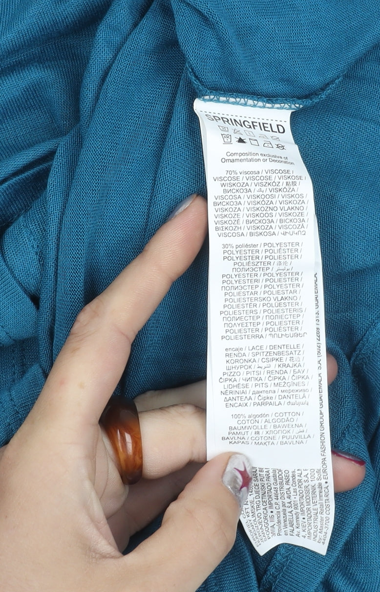 Refresh your wardrobe with this stylish Springfield women’s cardigan in a vibrant blue hue, ideal for adding a pop of colour to your everyday outfit. Designed in a flattering V-neck style with a delicate lace trim along the neckline and front edge, it offers a feminine touch that makes it versatile for both casual and slightly dressier occasions. Crafted from a comfortable and lightweight blend of 70% viscose and 30% polyester for the main body, the cardigan drapes beautifully and feels soft on the skin. The lace trim is made from 100% cotton, adding texture and enhancing the overall design.This medium-sized cardigan, designed for women, features a regular fit and long sleeves, making it perfect for transitional weather during spring, summer, and autumn. The tight-knit construction ensures durability while maintaining a comfortable wear, whether layered over a top or worn on its own. The knit fabric type gives it a smooth appearance with no pattern, keeping the look simple, modern, and easy to pair with various outfits.Machine washable for easy care, this cardigan is a practical choice for the everyday wardrobe. The crochet accent along the trim provides subtle detailing without overwhelming the minimalist styling. Its lightweight nature makes it an excellent travel companion, as it can easily be packed and layered when needed.In excellent pre-owned condition with only light signs of wear, this cardigan still has plenty of life left and is ready for its next chapter. Style it with jeans for a relaxed weekend look, or pair it with tailored trousers or a skirt for a chic workwear alternative. With its classic design, quality materials, and flattering fit, this Springfield cardigan will soon become a go-to layering piece in your collection.Perfect for the woman seeking comfort, style, and versatility, it’s a wardrobe staple worth adding to your seasonal rotation.