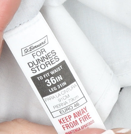 These St Bernard for Dunnes Stores men’s black dress trousers are a timeless and dependable wardrobe essential. Designed in a classic fit, they offer both comfort and sophistication. Crafted entirely from 100% polyester, these trousers provide a smooth texture with an intelligently lightweight finish, ideal for long days at the office or smart evening wear. The mid-rise waist and straight leg profile allow for a flattering shape, while the black colour ensures easy pairing with shirts, jackets, or knitwear for multiple smart looks. Featuring standard belt loops, two front side pockets, and a buttoned rear pocket for practicality, these trousers maintain a sharp, professional aesthetic. The front flat panel enhances a sleek silhouette while ensuring maximum comfort. With an inside leg measurement of 31 inches and a waist of 36 inches, they provide a consistent fit for regular builds. Easy to care for, the fabric is machine washable, maintaining its appearance even after repeat wear. Perfect for business meetings, formal occasions, or anytime polished attire is required, their breathable polyester construction makes them versatile for year-round use, especially during spring, autumn, and cooler summer days. The easy-care and quick maintenance properties make them ideal for busy professionals. Finished with a traditional button and zip closure, these trousers combine reliable homestyle tailoring with contemporary appeal, making them a practical addition to any smart or workwear collection. Whether worn with polished shoes and a crisp shirt for the office, or with a blazer for more formal events, they deliver classic style and effortless refinement at an affordable value. A reliable essential for any modern wardrobe.