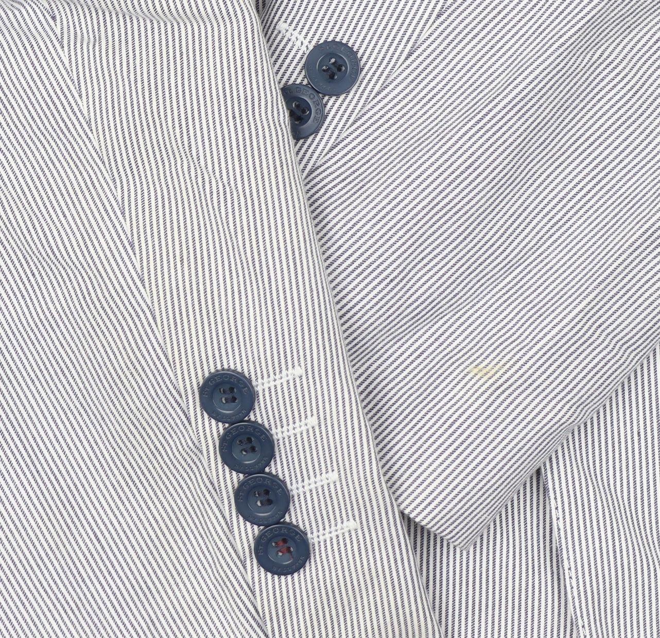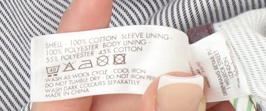 Step out in effortless contemporary style with this St George by Duffer men's blazer. Crafted from breathable 100% cotton, this tailored jacket offers a timeless blue and white pinstripe pattern, perfect for casual yet refined dressing. The single-breasted two-button front with notch lapels gives a versatile silhouette that works as well over a crisp shirt for smart occasions as it does with jeans for laid-back weekends. A pair of spacious patch pockets and a chest pocket combine practicality with modern charm, while the burgundy inner lining adds a touch of sophistication every time you slip it on. With its four-button cuff detail and double-vented back, comfort and mobility are guaranteed. The regular fit design ensures it flatters most body types without feeling restrictive. Made for the warmer spring and summer months, this jacket allows breathability without compromising on elegance. It’s machine washable for easy care and features a soft polyester and cotton lining that ensures a polished inner finish. Condition is very good overall with only a minor mark to the sleeve that doesn’t detract from its stylish appearance. Ideal for casual, weekend or smart-casual wear, this blazer fits effortlessly within a modern wardrobe, pairing easily with chinos or dark denim. A must-have staple for any man seeking refined British design with a relaxed feel, this piece speaks of understated quality. The St George by Duffer brand is known for combining heritage tailoring with contemporary street style, making this blazer a reliable choice for versatile, everyday sophistication.