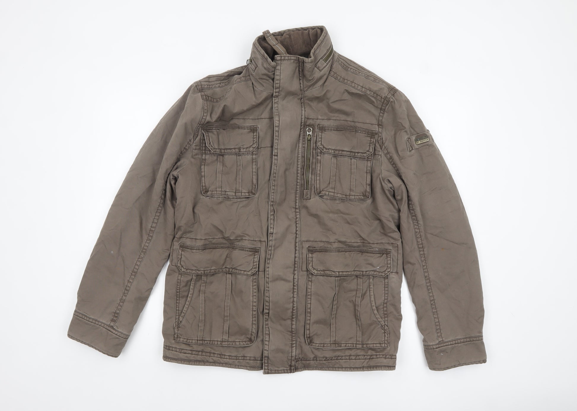 This St George by Duffer men's jacket is a stylish and practical addition to any wardrobe. Designed in a classic military style, this mid-length jacket in a warm brown shade combines comfort, durability, and timeless appeal. Crafted from 100% cotton, the outer shell offers a natural, breathable texture with a twill weave that provides strength and a refined appearance. The lining is also cotton, ensuring soft comfort that makes it ideal for layering throughout autumn and winter.The jacket features functional details such as a full zip front closure with button fastening for added protection against the cold, multiple flap and zip pockets that enhance its practical design, and a stand-up collar for a rugged yet structured silhouette. Its Regular Fit allows easy layering over shirts or knitwear, while the collared feature adds a classic touch to a casual outerwear piece. Subtle branded tabs and durable stitching give it a premium look associated with St George by Duffer’s high-quality craftsmanship.This coat is perfect for outdoor walks, weekend wear, or casual everyday use, offering both warmth and versatility. The neutral brown tone makes it easy to pair with denim, chinos, or boots, giving a smart casual look suitable for a variety of occasions. The jacket shows very light wear and mild creasing, consistent with gentle previous use, but remains in overall very good condition with plenty of life left in it.Ideal for men who appreciate utility-inspired style with understated sophistication. Whether you are heading out for a countryside walk or commuting to town, this piece will keep you comfortable while maintaining a classic, masculine aesthetic. A quality example of British design with practical features and year-round wearability.