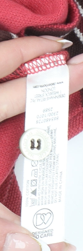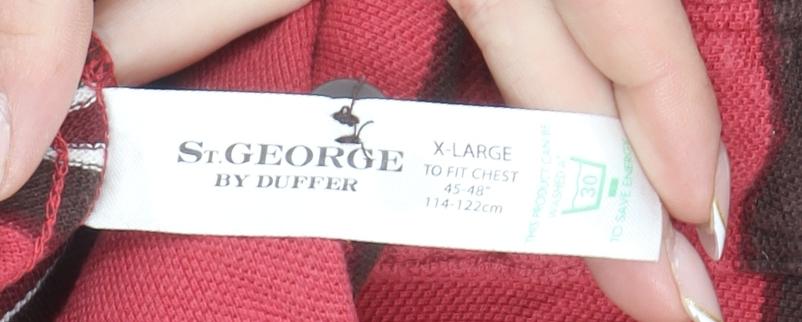 Upgrade your casual wardrobe with this stylish St. George by Duffer men's short-sleeve polo shirt in a bold red with black and white horizontal stripes. Designed in a comfortable regular fit, this polo perfectly balances classic British style with easy-going everyday comfort. The collared neckline and button placket add timeless detail, while the embroidered chest logo enhances its refined appearance. Crafted from 100% cotton, the fabric is soft, breathable, and durable—perfect for wear across warmer seasons like spring and summer. Ideal for casual outings, relaxed weekends, or smart-casual gatherings, this versatile piece pairs effortlessly with chinos, jeans, or shorts. The high-quality construction ensures longevity, making it a great addition to any modern man’s wardrobe. The shirt is machine washable for hassle-free care, and its regular fit provides a flattering silhouette suitable for most body shapes. In very good used condition, this polo shows only minor signs of previous wear with no major flaws, retaining its colour and structure beautifully. Whether worn for casual afternoons, outdoor social events, or laid-back workdays, this St. George by Duffer polo offers a balance of style and comfort that works all year round. A dependable wardrobe essential for men who appreciate classic design with understated flair. Chest size fits approximately 114–122 cm (45–48 inches), providing a relaxed, comfortable feel without compromising on shape or structure. Add this St. George by Duffer red striped polo to your wardrobe for a timeless casual look that always feels confident and effortlessly put together.