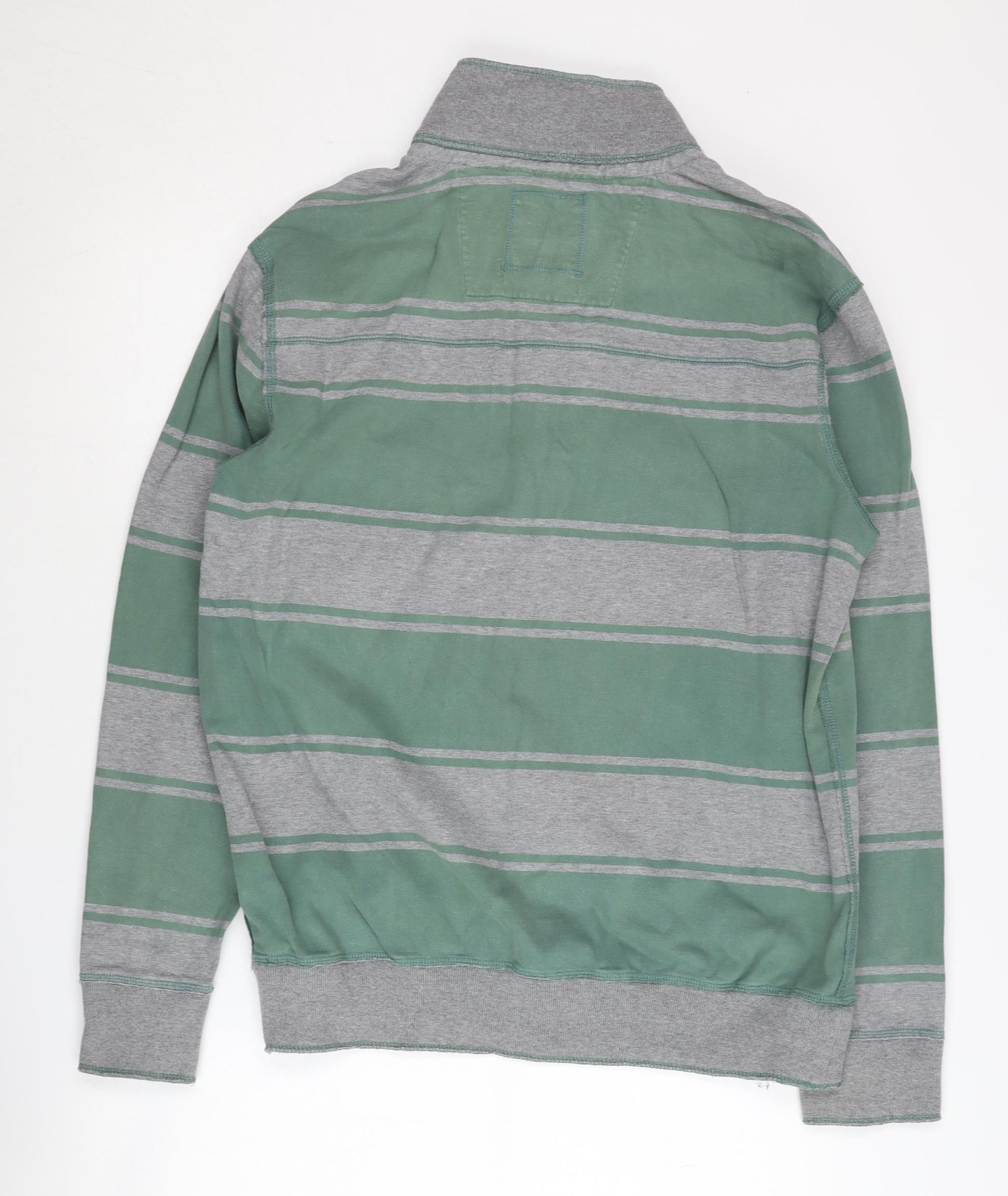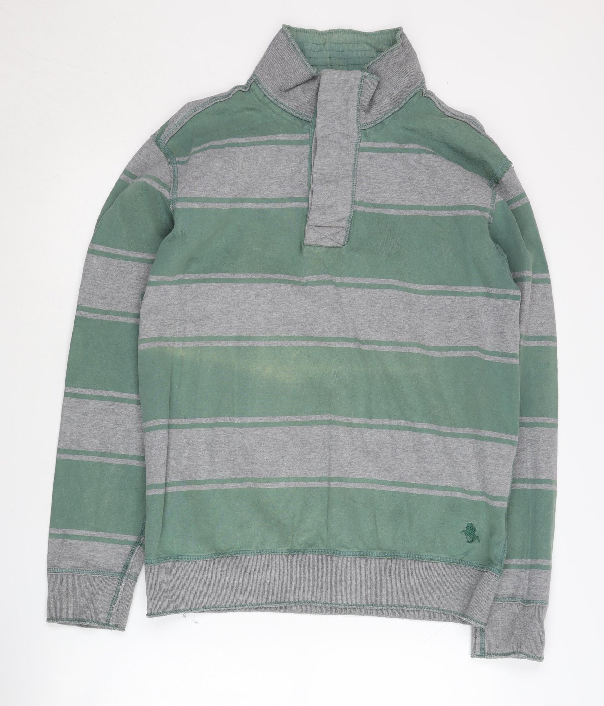 Stay warm and stylish with this St George by Duffer men's sweatshirt. The classic striped design in green and grey lends a timeless appeal, perfect for casual occasions. Designed with a high neckline and long sleeves, this Henley style sweatshirt provides both comfort and warmth, ideal for autumn and winter wear. Constructed from knitted cotton fabric, it ensures a comfortable fit and breathability throughout wear. Whether you're heading out for a casual day or relaxing at home, this versatile piece is sure to become a wardrobe favourite. Despite slight discolouration on the front, it remains in good condition for continued use. Ideal for layering or worn on its own, this sweatshirt caters perfectly to those seeking both function and style at a reasonable price.