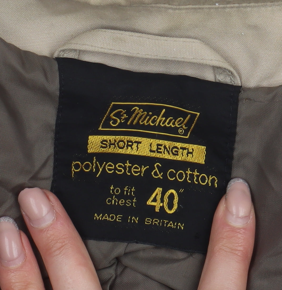Elevate your wardrobe with this classic St Michael men's overcoat, crafted in a sophisticated beige tone. This short length coat perfectly combines style and function, making it a versatile addition to any outfit. Made in Britain, it features an outer shell composed of a blend of polyester and cotton, providing comfort and durability. With a chest size of 40 inches, this coat offers a classic fit that suits a range of body shapes. The minimalist design is accentuated by its clean silhouette and standard features, ensuring an effortlessly stylish look. Ideal for cooler days, this vintage piece from St Michael promises timeless appeal and quality craftsmanship. Whether you're heading to a business meeting or a casual outing, this coat enhances your ensemble with understated elegance.