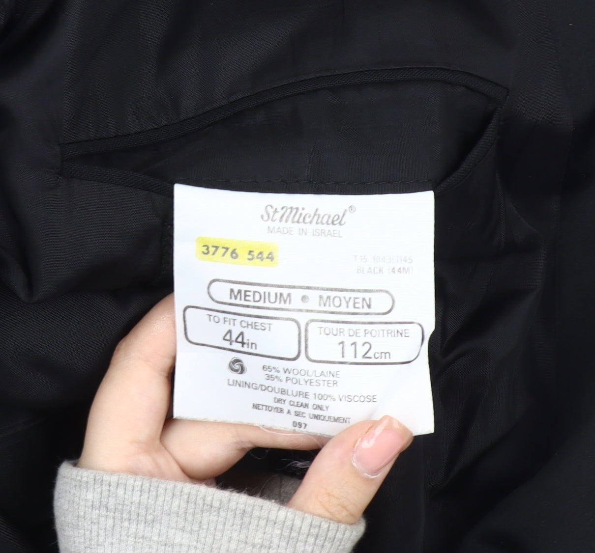Discover elegance with the St Michael Men's Black Double-Breasted Blazer, tailored for formal occasions. Crafted from a premium blend of 65% Wool and 35% Polyester, this medium-sized formal wear offers a luxurious feel and a sophisticated look. The blazer showcases a classic peak lapel design, enhancing its timeless appeal, and features a two-button front, perfectly suited for your next formal or business gathering. Stay warm and stylish during the colder months with this smart addition to your wardrobe. The jacket's lining is made from high-quality viscose, ensuring comfort and durability, while its three-button sleeve design adds a touch of polished detail. The ventless back and meticulous tailoring provide a sleek and structured silhouette, ideal for impressing in any formal setting. This elegant piece, with no pattern and no added frills, serves as a versatile staple for any gentleman's wardrobe. Available in a classic black shade, this blazer pairs effortlessly with a variety of trousers and shirts, allowing you to customise your look with ease. Elevate your formal attire with this elegant and understated blazer, perfect for weddings, business meetings, or any formal event.