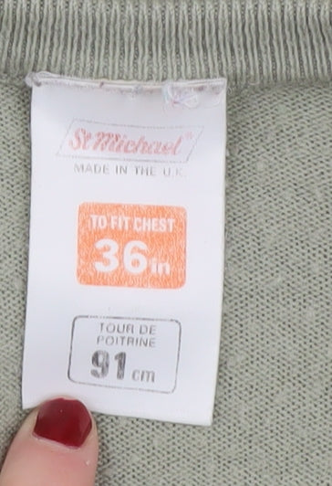 Discover the timeless appeal of this men's vintage St Michael pullover jumper in a versatile green hue, perfect for adding a touch of classic style to any wardrobe. Crafted from 100% acrylic, this lightweight knit jumper is designed for comfort and durability, offering excellent warmth and easy care with machine washability. With a V-neckline that provides a flattering fit, this long-sleeve jumper is not only an ideal choice for chilly autumn and winter days but also effortlessly complements casual wear. The jumper features a regular fit suitable for everyday outings or informal gatherings, making it a staple for the modern man's wardrobe. While it displays minor damage, it remains in good overall condition and adds a unique vintage charm. Embrace the heritage and stylish design of St Michael, a renowned brand synonymous with quality. Available in a convenient size small, this jumper is a perfect gift for the discerning fashion enthusiast looking to embrace both comfort and style. Elevate your seasonal attire with this classic pullover, known for its understated elegance and practicality.