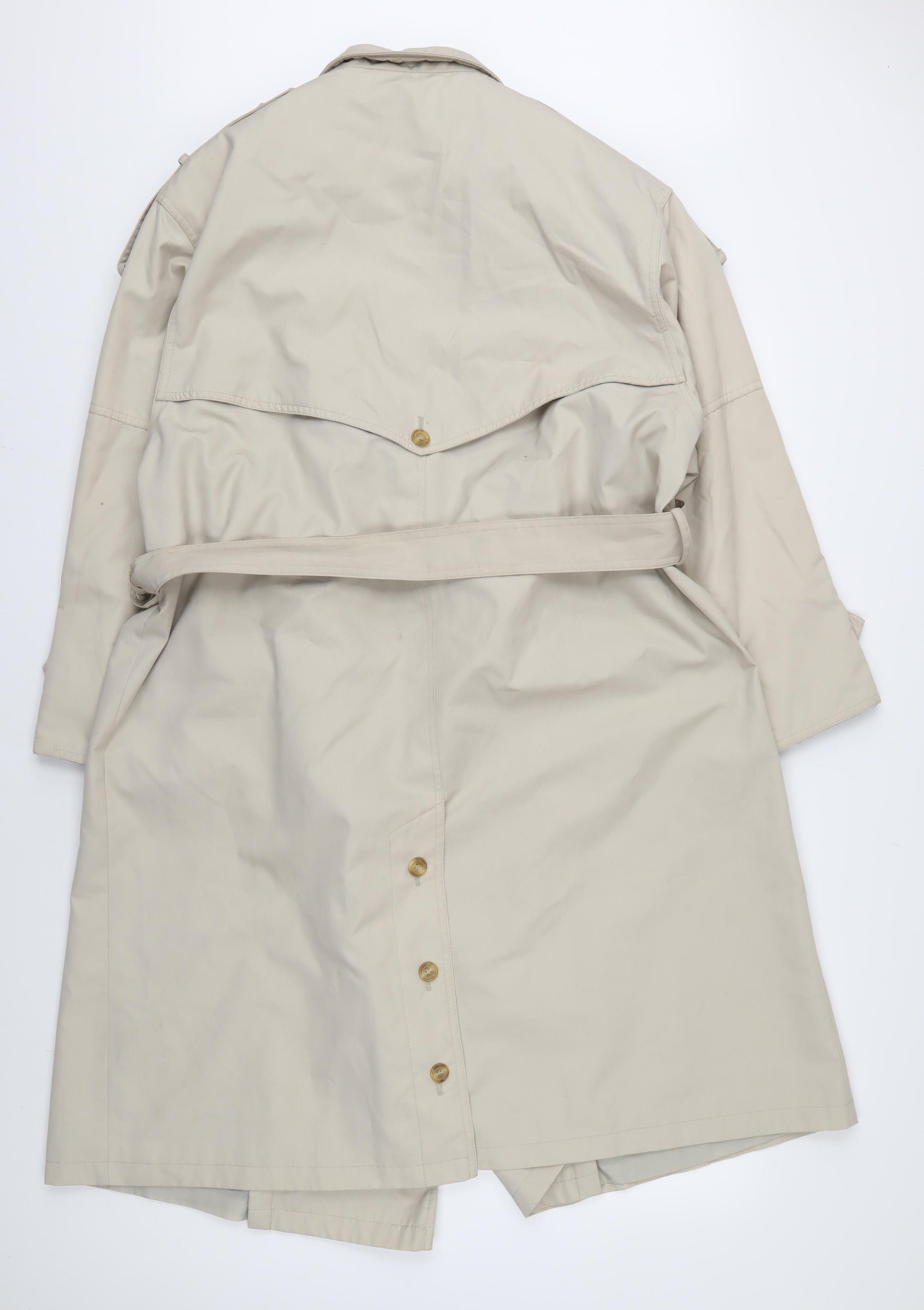 Elevate your outerwear collection with this timeless St Michael Women's Trench Coat in a sophisticated beige colour. Designed for the discerning woman, this coat combines classic charm with a modern fit. Crafted from a quality blend of polyester and cotton, it ensures durability and comfort, making it ideal for the changing seasons of autumn and spring. The coat features a regular fit with a mid-length design, perfect for enhancing any ensemble. A belted waist adds a flattering silhouette, while the collared neckline and button accents exude timeless elegance. This classic trench coat features long sleeves and a soft twill fabric, offering both style and functionality. Easy to care for, it is machine washable, ensuring convenience for everyday wear. With its lining made of polyester, it keeps you warm while maintaining a lightweight feel. Perfect for casual occasions, this coat is a versatile addition to your wardrobe. Despite being pre-owned, it remains in excellent condition with no visible damage, promising lasting quality. Whether you're heading to work or enjoying a leisurely outing, this St Michael trench coat is the stylish choice for the modern woman. Don't miss out on the chance to own this elegant piece, seamlessly blending classic design with contemporary appeal.