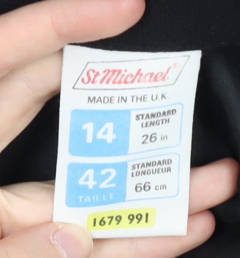 Step out in style with this classic St Michael black A-Line skirt, designed for the modern woman. Crafted from a refined blend of polyester and wool, it provides comfort and durability while exuding timeless elegance. The knee length offers a versatile look that is perfect for both casual and formal occasions. With its regular fit in size 14, this skirt complements a variety of body types, ensuring a flattering silhouette. The all-black design with no pattern makes it a versatile staple in any wardrobe, easy to pair with blouses, shirts, or jackets for a chic ensemble. Despite its gently worn condition, this skirt maintains its excellent shape, making it a valuable addition to your collection at a competitive price. Ideal for autumn or winter wear, this piece matches well with boots or heels and is suited for both daytime outings and evening engagements. Don't miss out on the opportunity to own a piece of fashion history with this St Michael skirt, embodying classic style and British craftsmanship.