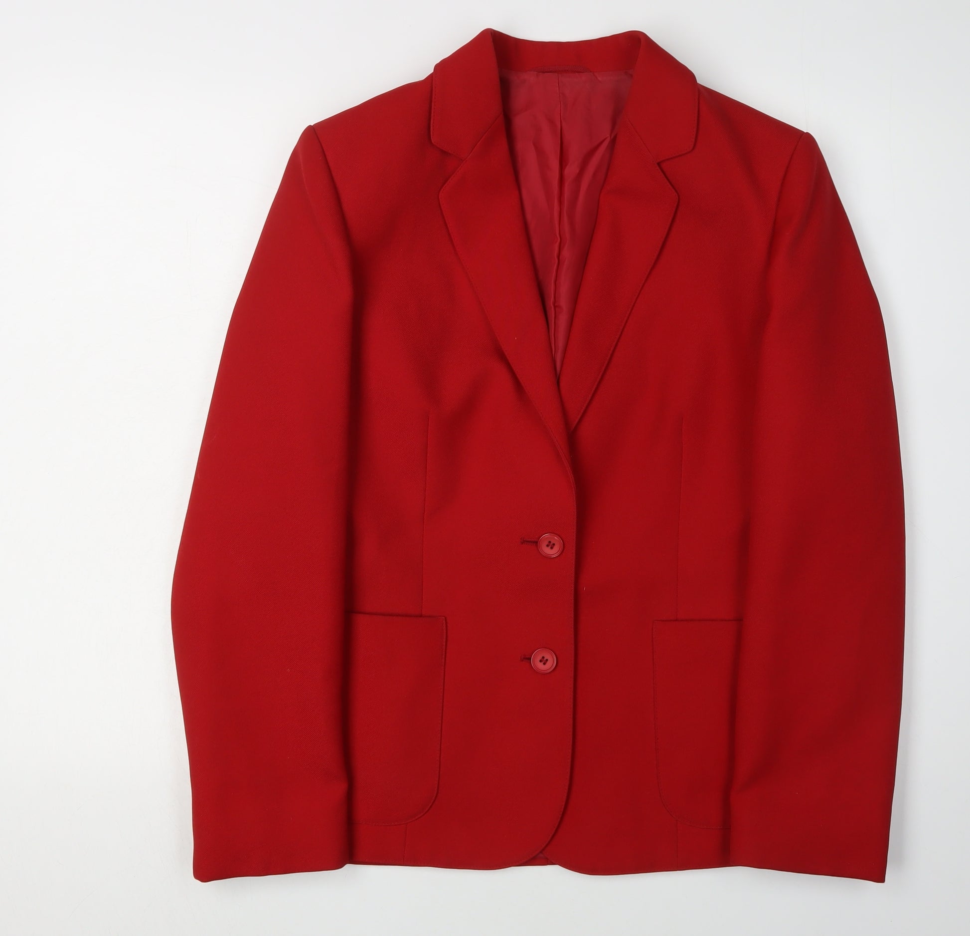 Step into style with this stunning St Michael women's red blazer. Perfect for making a bold statement, this classic piece is both versatile and stylish, ideal for workwear or smart-casual occasions. Crafted from high-quality woven polyester, it offers a comfortable fit and long-lasting wear. The blazer features a single-breasted design with a notch lapel and two-button closure for a sleek, tailored appearance. It is fully lined with a soft polyester and nylon blend, ensuring a smooth feel against the skin. Tailored to a regular size 14, this blazer boasts long sleeves and a regular jacket length, making it a perfect fit for most women. Its timeless red hue adds a vibrant pop to any wardrobe while effortlessly complementing a variety of outfits. Whether you're heading to a business meeting or a casual day out, this blazer provides both style and functionality. Grab this classic piece today and elevate your fashion game. Condition is excellent with no visible flaws.