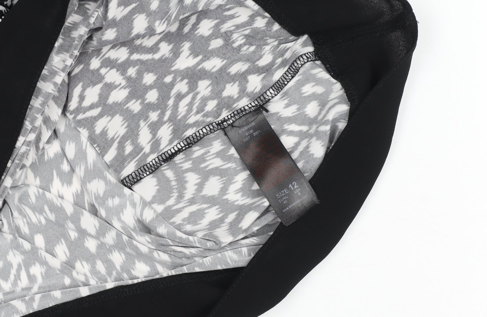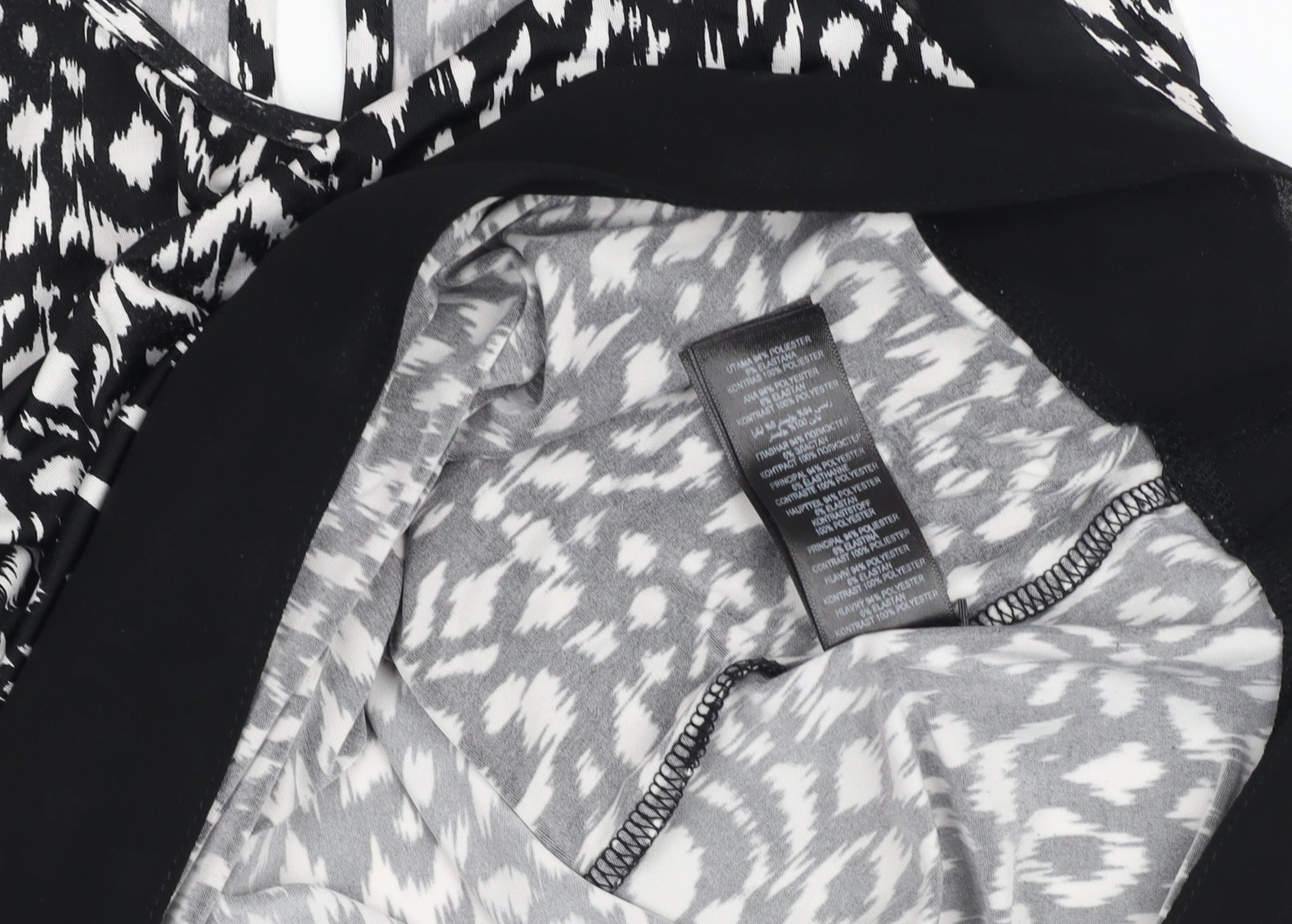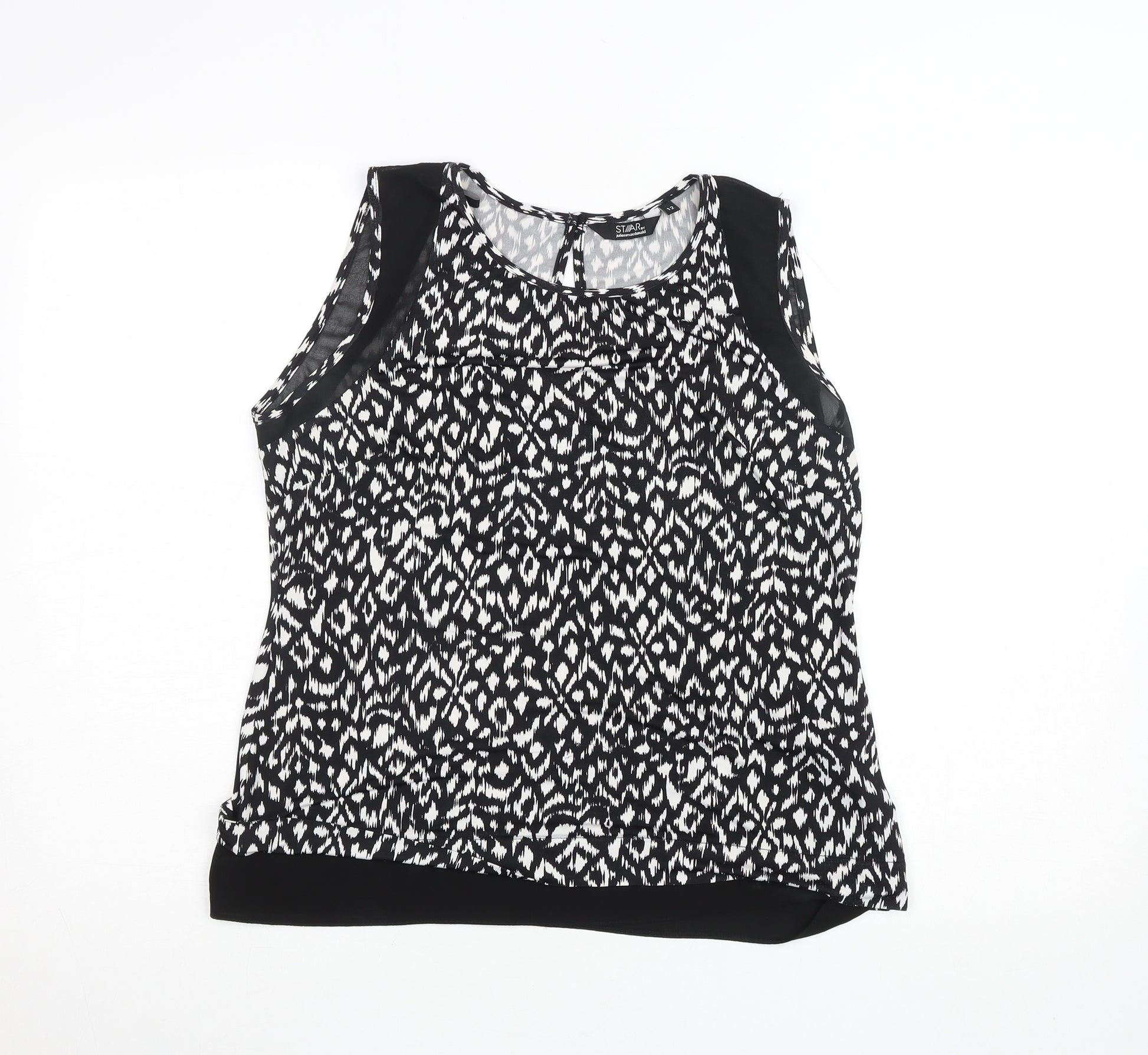Add a touch of chic sophistication to your wardrobe with this stunning black and white patterned sleeveless blouse from Star by Julien Macdonald. Designed for the modern woman, this top is perfect for both professional and casual occasions. Crafted from a comfortable and lightweight jersey fabric made of 95% polyester and 5% elastane, it offers a soft stretch fit that moves effortlessly with your body while maintaining structure and elegance. The eye-catching geometric pattern in monochrome tones creates a versatile look that can be styled easily with jeans, trousers, or skirts. The blouse features a flattering scoop neckline with fine detailing and a button fastening at the back, adding refinement to its classic silhouette. The design includes contrasting black panels at the shoulders and hemline, giving the piece a sleek, contemporary edge. The breathable fabric makes it ideal for spring and summer, while it can be layered under a blazer for cooler months. Whether for workwear or a casual evening out, this blouse combines sophistication and comfort in equal measure. In excellent pre-loved condition with no visible flaws, this quality garment retains its shape and style beautifully. Effortlessly elegant and easy to care for, it’s machine washable for hassle-free maintenance. Update your collection with this versatile piece that embodies the stylish essence of Julien Macdonald’s Star line – a timeless blend of modern design and feminine grace, perfect for the confident woman who values both fashion and comfort.