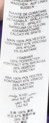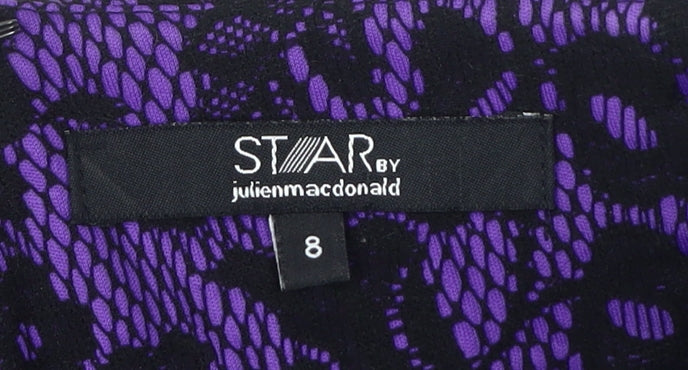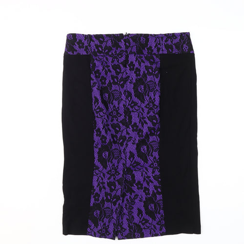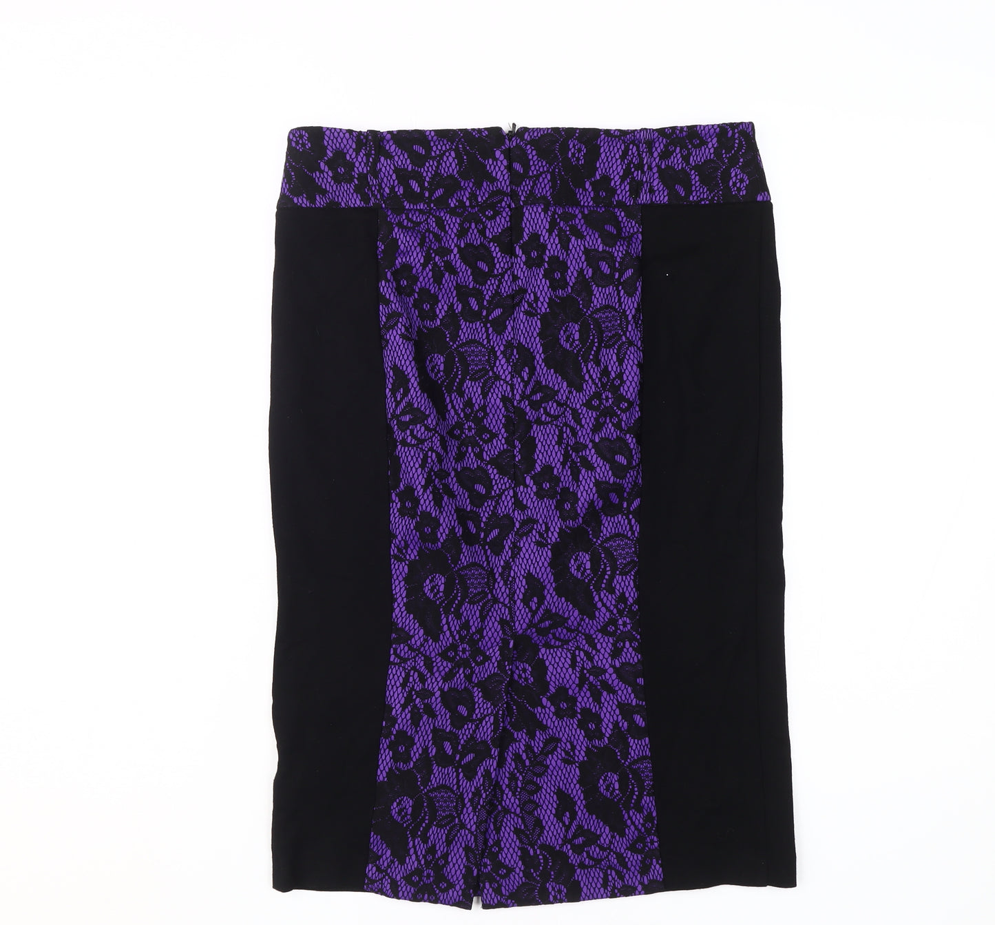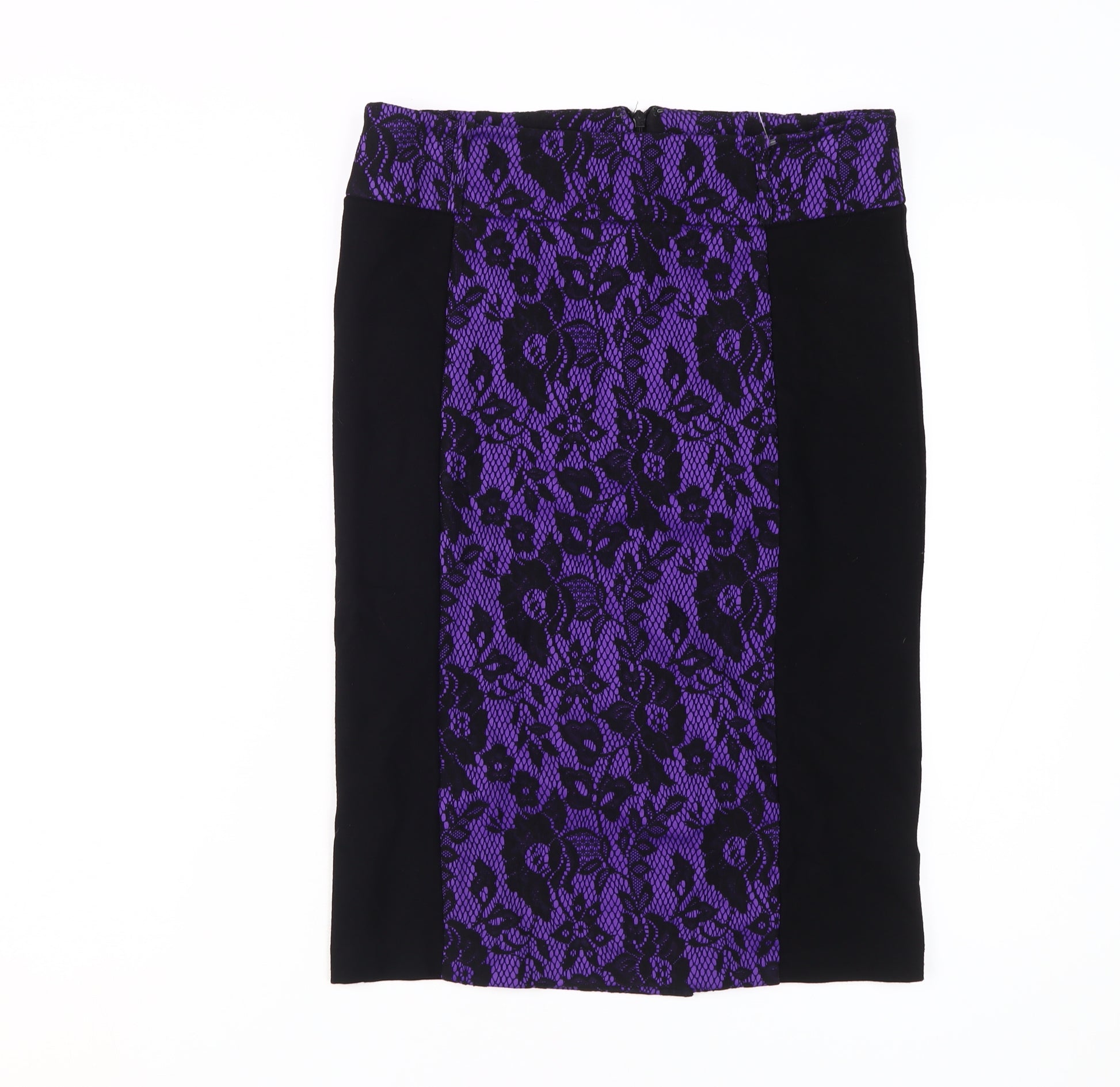 Drape yourself in elegance with this Star by Julien Macdonald women's pencil skirt in a striking combination of purple and black. Designed to accentuate the feminine silhouette, this skirt is perfect for those who want to make a bold fashion statement. The floral lace pattern adds a touch of sophistication, making it suitable for various occasions. Crafted from high-quality materials, including polyester, viscose, nylon, and elastane, it promises comfort and longevity. The skirt features a zip closure for a secure fit, offering both style and practicality. While ideal for formal settings, it's versatile enough to be dressed down for a more casual look. Despite being in excellent condition, this piece is a terrific addition to any wardrobe, promising to attract compliments wherever you go. Embrace a chic, timeless look with this unique pencil skirt.