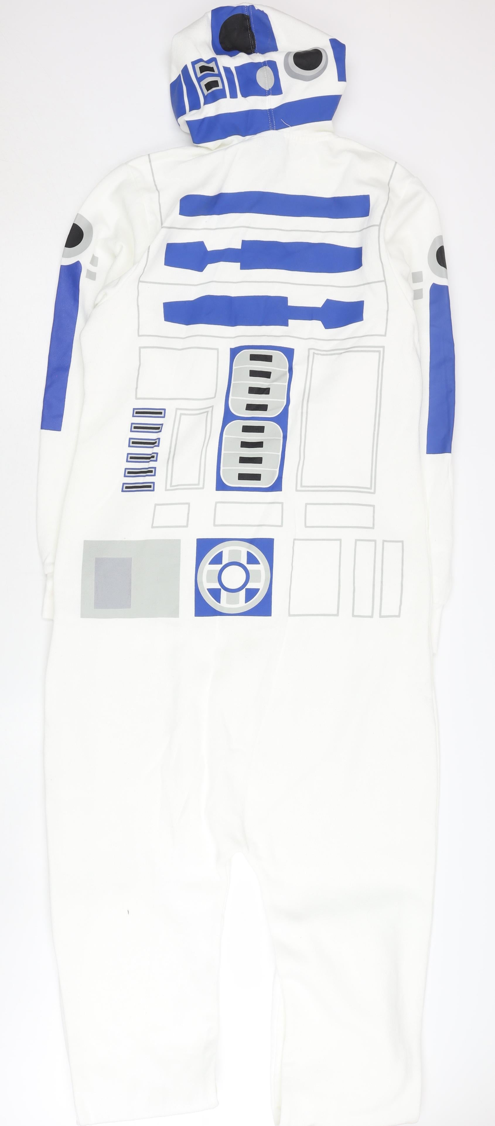 Don the timeless charm of a galaxy far, far away with this Star Wars R2-D2 onesie. Crafted for avid fans and comfort lovers alike, this men's one-piece nightwear is your ticket to cosy relaxation and a nod to iconic cinematic history. Made with a plush blend of 65% Polyester and 35% Cotton, this hooded onesie ensures warmth and softness during those chilly winter nights. The graphic print celebrates everyone's favourite droid, seamlessly merging style with fandom. Designed for ultimate convenience with a zip closure, getting in and out is effortless. Subtle logo accents add a touch of authenticity, making this a genuine collectors' piece. With originality in every stitch, this Star Wars onesie perfectly balances function and flair, making it an essential for sleep or lounging during marathons of your favourite movies. Machine washable for easy care, it's more than just sleepwear—it's an experience. Brand new with tags, this item stands as a pristine addition to any collection. Secure yours today and embrace the force of relaxation and intergalactic style.