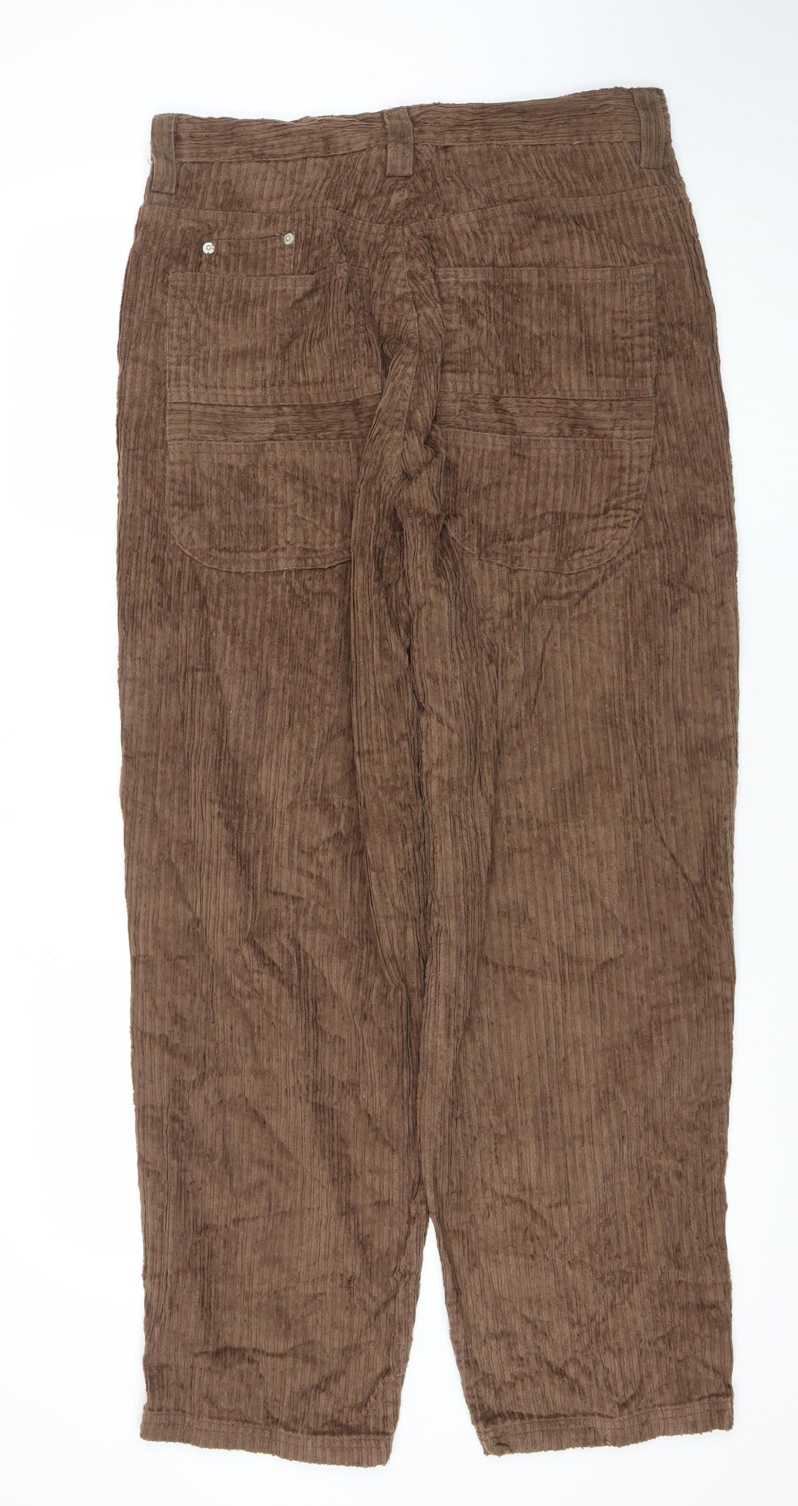 Step into relaxed style with these Star Wear women's brown cargo trousers, designed for both comfort and versatility. Crafted from 100% cotton, the soft corduroy texture offers breathable wear that feels comfortable throughout the day. The natural cotton fabric allows excellent airflow, making these trousers suitable for cooler autumn and winter days while maintaining a warm, cosy fit.Offering a casual yet practical design, the trousers feature multiple pockets for added functionality, perfect for everyday errands or travel. The button and zip closure provides a secure fit, while the straight leg cut ensures a classic silhouette that flatters all body types. Thoughtful detailing such as the belted waistband and neatly stitched seams adds a retro flair to the overall look, making these trousers both timeless and modern.Versatile enough to pair with a relaxed knit jumper, fitted top, or even a smart blouse, they easily adapt from casual daytime wear to low-key evenings out. The rich brown tone complements a wide range of colours, offering easy coordination within any wardrobe. Ideal for women who value both practicality and understated style, these trousers combine durability and comfort perfectly.Made in Bangladesh, these high-quality cotton trousers are machine washable, allowing for easy care and maintenance. In very good pre-loved condition, they show minimal signs of gentle use, maintaining their texture and structure beautifully. Whether you're exploring city streets, going for a countryside stroll, or simply relaxing at home, these cargo trousers from Star Wear promise a dependable fit and a touch of effortless everyday style.Add these brown cotton cargo trousers to your wardrobe for a flexible seasonal essential that pairs comfort with a timeless, laid-back aesthetic.