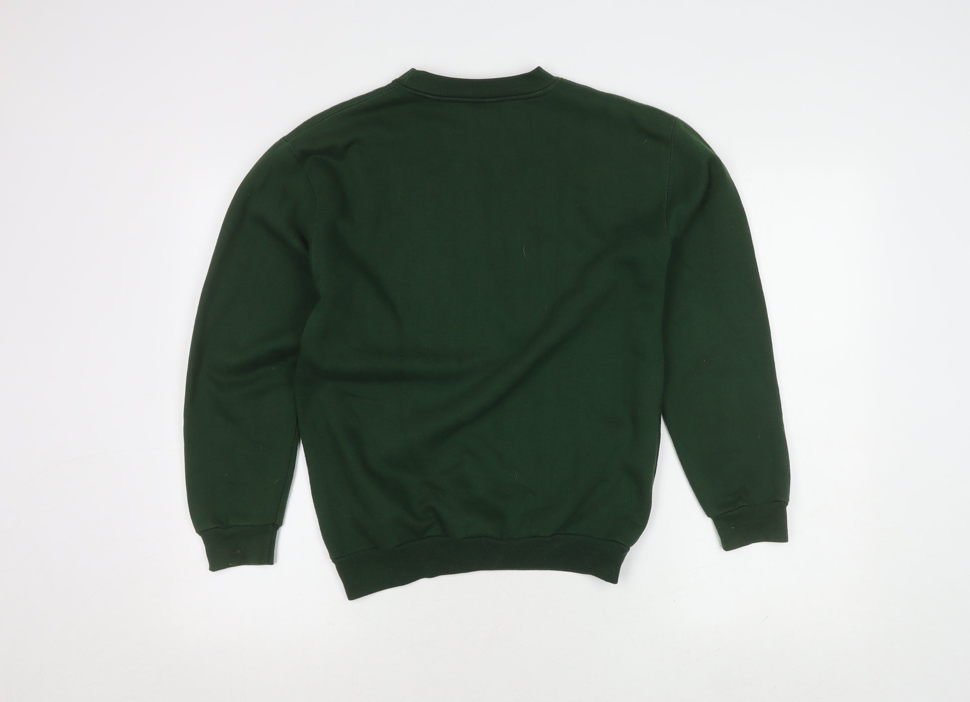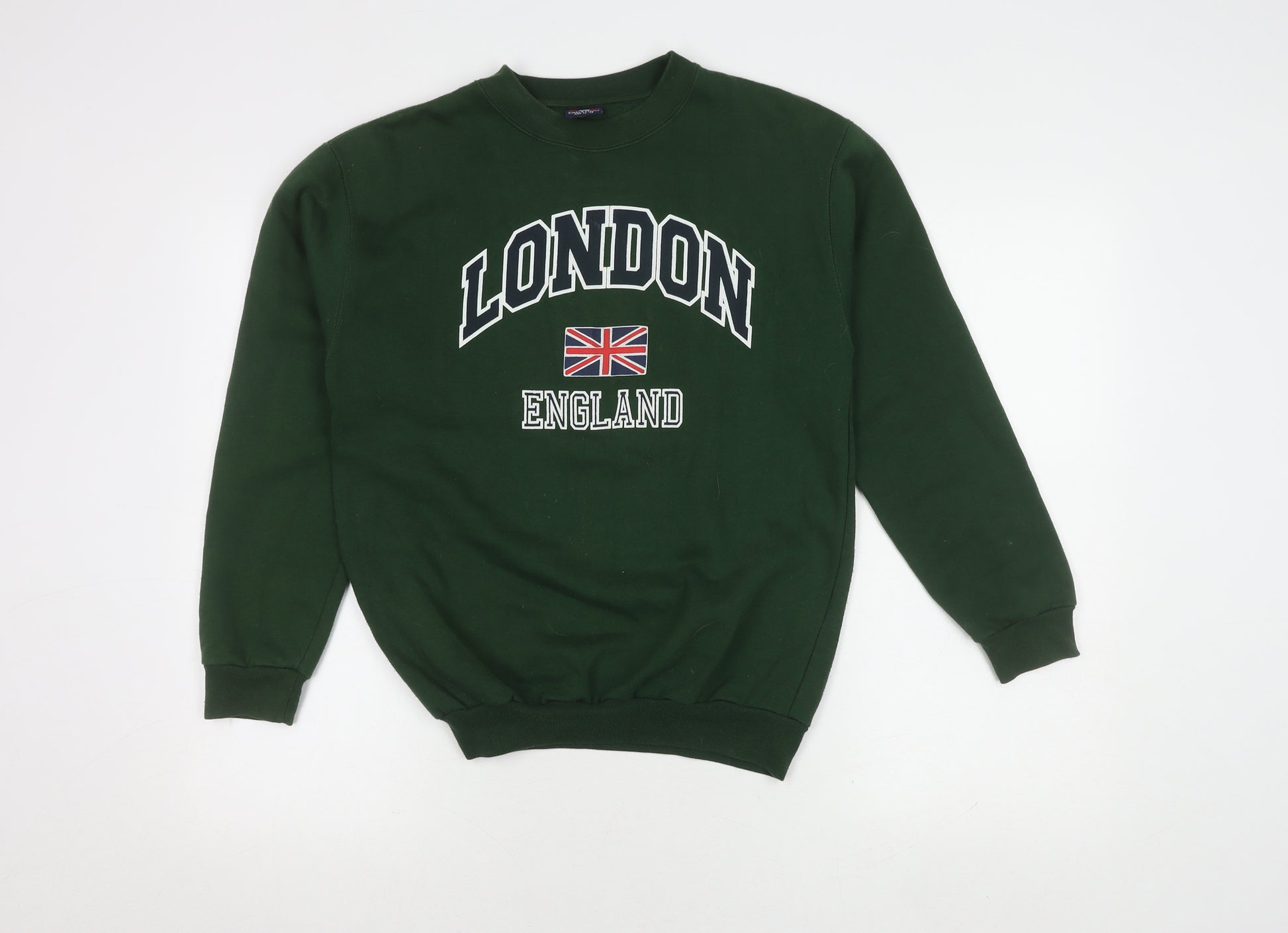 Embrace the iconic British spirit with this Stars & Stripes Boys Green London Jumper in size 12-13 years. Featuring a classic crew neck and long sleeves, this pullover is perfect for casual wear throughout all seasons. Made from a comfortable blend of 65% cotton and 35% polyester, the knit fabric ensures a soft feel against the skin while remaining machine washable for easy care. The standout graphic print showcases 'London' along with the Union Jack, making it a perfect addition to any travel-themed wardrobe. In very good condition with slight signs of wear but no visible tags, this jumper is a fantastic choice for any young adventurer looking to express their love for the city of London. Ideal for everyday wear, this jumper fits comfortably and pairs effortlessly with jeans or joggers for a laid-back look. Priced competitively at £9.75, this jumper offers great value and style. Don’t miss out on this chance to grab a piece that resonates with British charm and casual elegance.