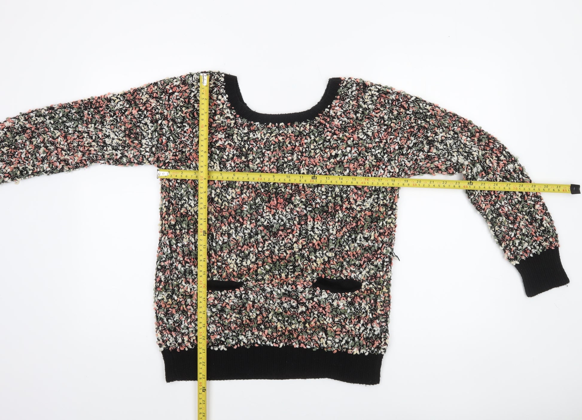 Add a pop of texture and charm to your wardrobe with this stylish women’s chunky knit jumper by Stella Morgan. Crafted entirely from soft acrylic, this cosy pullover ensures both comfort and durability, ideal for layering throughout the cooler months. The multicoloured design features a delightful mix of black, pink, green, and white tones, creating a unique and eye-catching pattern that enhances any casual outfit. With its scoop neckline and ribbed cuffs and hem, the jumper provides a flattering and comfortable fit. The long sleeves and relaxed cut make it perfect for everyday wear, while the tactile knit texture gives it a modern yet cosy look. Designed in a size 12 regular fit, it pairs beautifully with jeans, skirts, or leggings for an easy, stylish ensemble. Lightweight yet warm, this jumper is ideal for autumn and winter, offering the right balance of comfort and breathability. Whether for a relaxed weekend outing, a casual workday, or a coffee date, this Stella Morgan knit is versatile enough for multiple occasions. Its hand wash only care ensures longevity, keeping the fabric vibrant and soft wear after wear. In excellent pre-owned condition, it shows minimal signs of use and remains in great overall shape. A must-have piece for any knitwear lover looking for style, quality, and comfort combined. Refresh your knitwear collection with this lovely chunky-knit pullover and enjoy effortless style throughout the season.