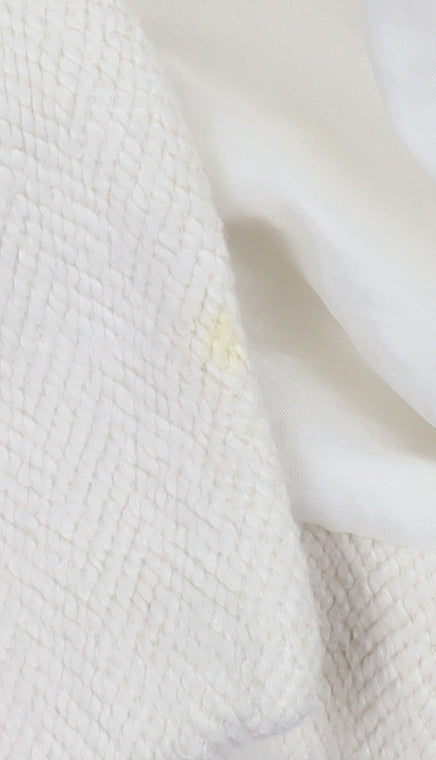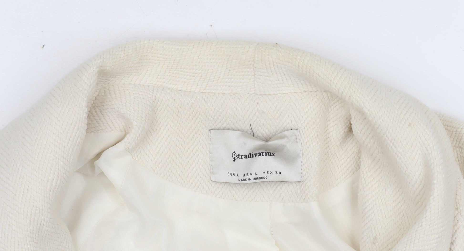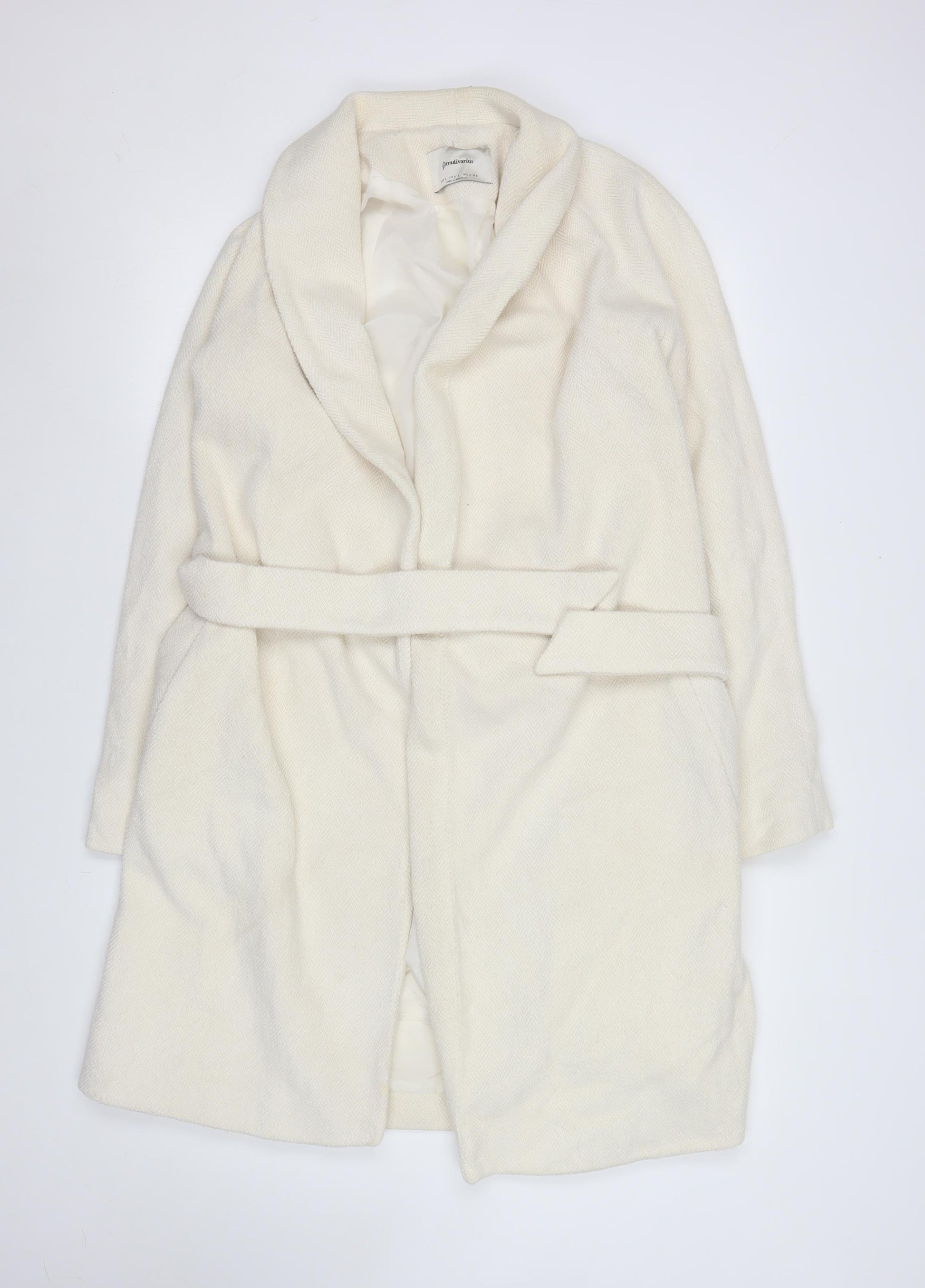This elegant ivory coat from Stradivarius is a timeless addition to any wardrobe, offering both comfort and sophistication for the colder months. Expertly crafted in Morocco using a soft and warm blend of wool and polyester, this beautifully structured coat exudes a classic, minimalist style. The mid-length design and belted waist create a flattering silhouette, while the shawl collar adds a touch of understated glamour. Its fully lined interior provides additional warmth and ensures a smooth and comfortable fit, making it ideal for layering over your autumn and winter ensembles.Perfectly suited for casual and everyday wear, this women’s coat captures a refined sense of style that works effortlessly for city outings, work commutes, and evening walks alike. The tie closure allows for easy fastening and an adjustable fit, ensuring both practicality and elegance. The ivory hue offers a sophisticated neutral palette that coordinates seamlessly with a variety of outfits, from tailored trousers to jeans and ankle boots.Although in very good condition, a faint yellow mark is visible near the collar, barely noticeable and not detracting from its wearable charm. Designed for the modern woman who values both chic design and comfort, this Stradivarius coat embodies versatility and durability. Its wool blend composition ensures warmth and longevity, maintaining its shape and soft touch through the seasons. A must-have transitional piece for any fashion-conscious woman looking to elevate her outerwear collection with a clean, classic aesthetic.With its belted waist, lined interior, and premium fabric blend, this coat remains an enduring wardrobe staple that enhances any look while keeping you stylishly warm.