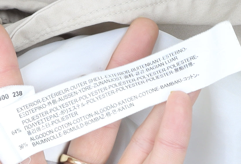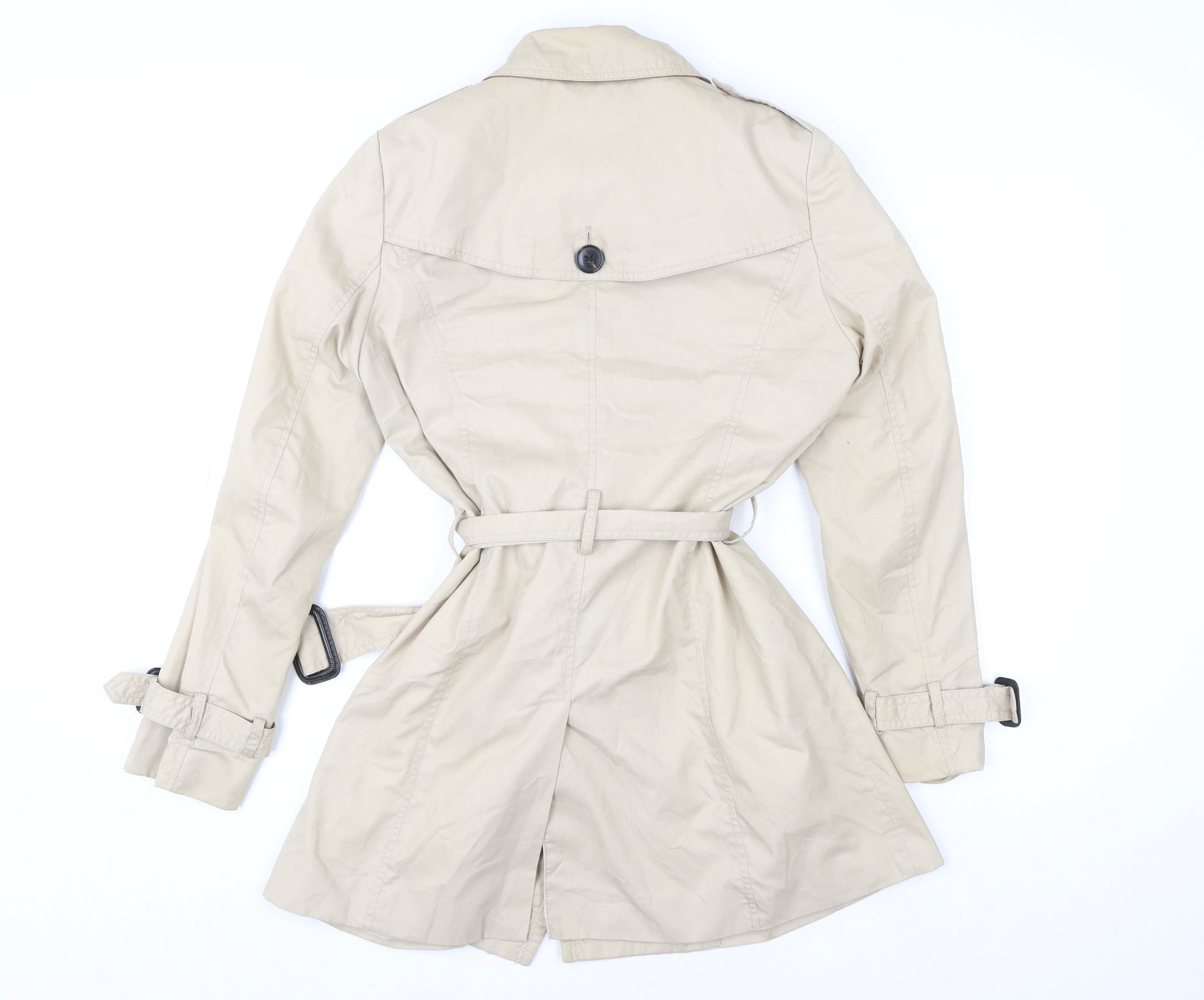 Step out in timeless elegance with this beautiful beige Stradivarius women’s trench coat. Perfectly styled for both casual and business occasions, this coat represents a classic wardrobe staple that never goes out of style. Crafted from a soft yet durable blend of 64% polyester and 36% cotton, the outer shell boasts a twill texture that ensures comfort and structure while maintaining a smooth, refined appearance. The mid-length cut offers versatile wear, flattering the figure and providing effortless coverage for cool spring and autumn days.The coat features traditional double-breasted button fastening, complemented by a matching waist belt that cinches beautifully for a polished silhouette. The collared neckline and belted cuffs add functional detail and a touch of sophistication. With practical side pockets and a neatly lined interior, this piece blends fashion and function seamlessly. The rich beige tone suits any outfit, easy to pair with jeans for a laid-back look or over a dress for a polished ensemble.Ideal for transitional seasons, this Stradivarius trench coat provides a classic fit, ensuring everyday comfort without compromising on style. It captures the effortlessly chic aesthetic Stradivarius is known for, making it an essential layer in every woman’s outerwear collection. Whether for work commutes, city strolls, or travel, this versatile coat promises long-lasting appeal and timeless sophistication.In very good pre-owned condition, with light signs of wear and minimal creasing, it remains in great shape and ready to wear. Machine washable for easy care, this elegant belted trench will quickly become your go-to choice for smart layering throughout the seasons.