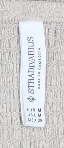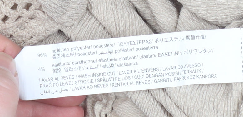 Refresh your summer style with this beautiful beige crochet camisole top from Stradivarius. Perfectly feminine and versatile, this sleeveless tank features a delicate crochet design on the bodice, paired with lightweight gathered fabric for a flattering and airy silhouette. The crochet detailing, combined with subtle button accents down the front, adds texture and bohemian charm while keeping the look effortlessly chic. Crafted from a soft blend of polyester and elastane, the top provides a gentle stretch for comfort and shape retention throughout the day.The soft beige hue makes this piece easy to pair with any outfit, whether you combine it with high-waisted jeans for a laid-back casual look or tuck it into a midi skirt for a more dressed-up style. With a V-neckline and delicate spaghetti straps, the design complements a variety of accessories and layers beautifully under cardigans or light jackets. Ideal for warm days and balmy evenings, it’s the perfect choice for holidays, casual outings, summer parties or relaxed weekends.This Stradivarius top, sized UK 12, fits true to size and flatters a regular figure. The breathable, lightweight construction makes it comfortable to wear during spring and summer. In excellent condition with minimal signs of wear, it maintains its original shape and appeal. Machine washable for effortless care, it’s ready for regular everyday wear. Combining comfort, versatility, and timeless design, this beige crochet camisole is a must-have for any wardrobe looking to add a touch of understated elegance with a bohemian twist. A perfect addition for the modern woman who values comfort and style in equal measure.
