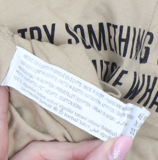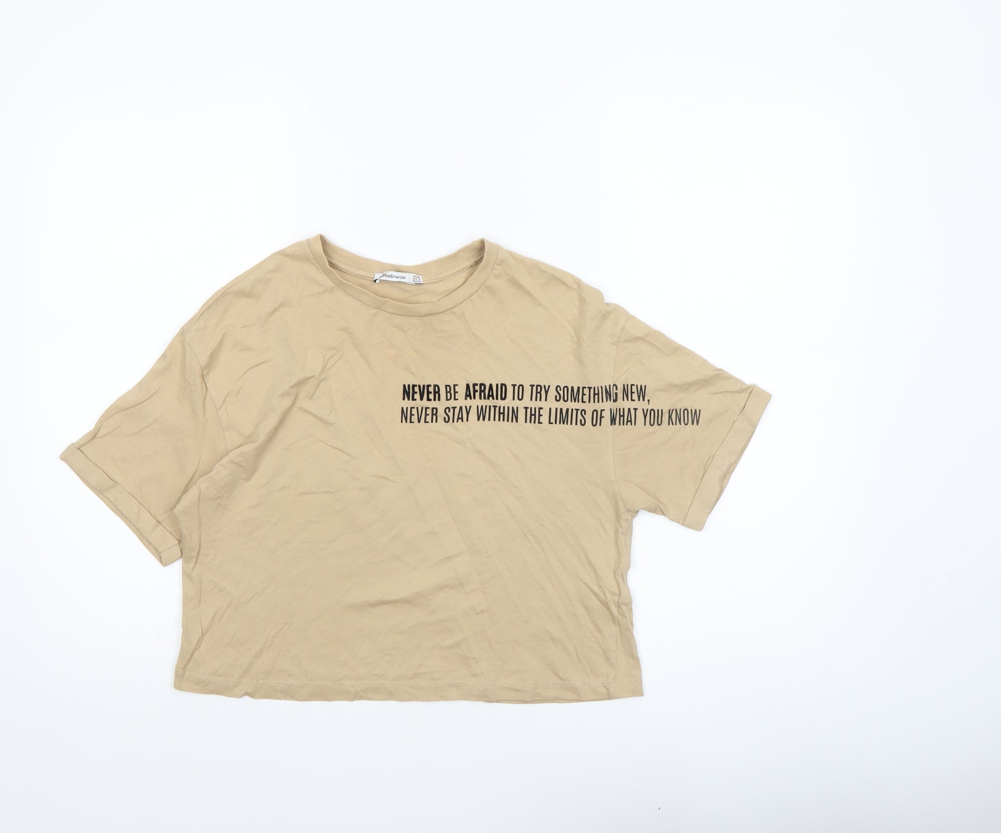 This contemporary Stradivarius women’s cropped T-shirt offers a relaxed yet stylish look perfect for everyday wear. Made from 100% soft cotton, it provides breathable comfort, making it an ideal choice for spring and summer seasons. The beige tone gives it a versatile and understated aesthetic, while the minimalist design with bold printed text across the front adds a fashionable edge. With a classic crew neckline and short casual sleeves, this top easily complements a variety of outfits — pair it with high-waisted jeans for a laid-back vibe or a tailored skirt for an effortless contrast of casual and chic. The cropped cut ensures a flattering fit, giving off an airy and youthful feel while still maintaining a polished silhouette. Constructed from a high-quality jersey fabric, the T-shirt is lightweight and durable, keeping you comfortable throughout the day. Its pullover design ensures ease of wear, making it perfect for women who enjoy fuss-free yet stylish wardrobe staples. The fit is relaxed, aligning with modern streetwear trends and allowing flexible movement whether you're heading to a café, shopping trip, or casual day out. In excellent pre-owned condition, this top has been well kept with no stains or visible flaws, ensuring you can enjoy it right away. The breathable cotton makes it easy to care for and machine washable, perfect for minimal maintenance. Add a touch of effortless confidence to your everyday style with this Stradivarius cropped T-shirt — ideal for those who appreciate simple sophistication with a statement twist. Whether you're layering or wearing it solo, it’s a wardrobe must-have that blends comfort and fashion seamlessly.