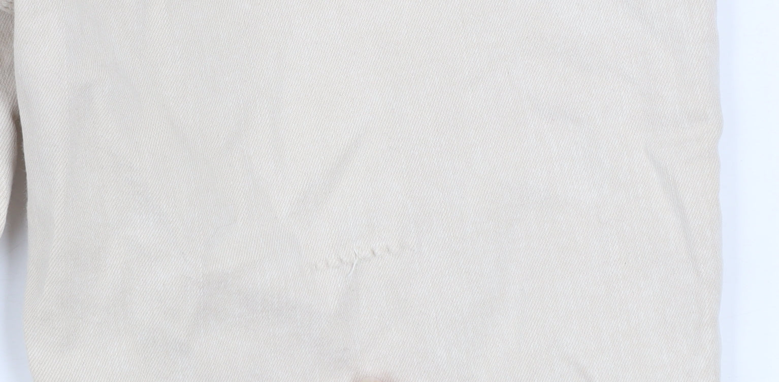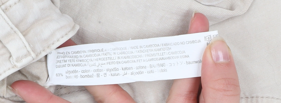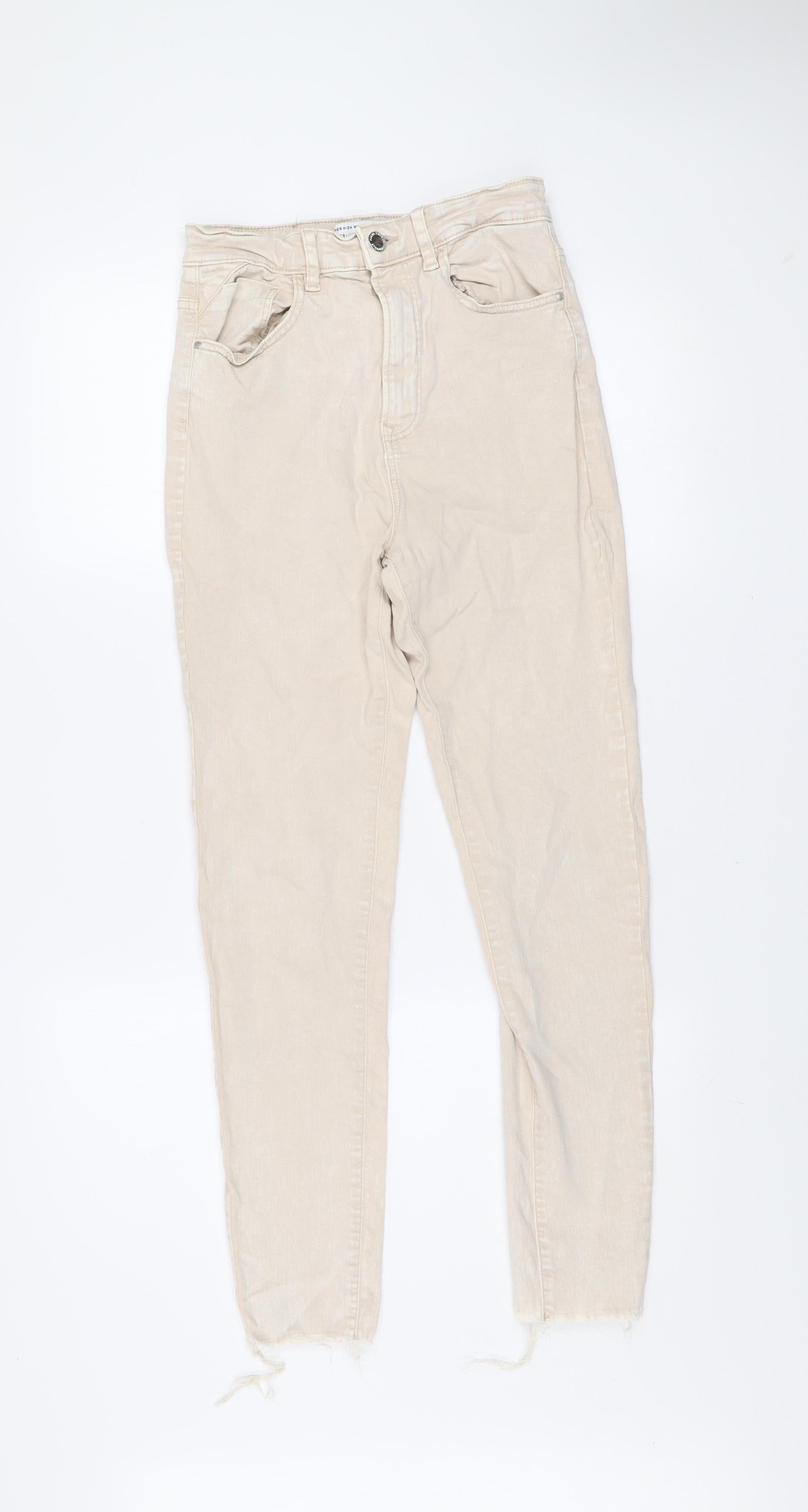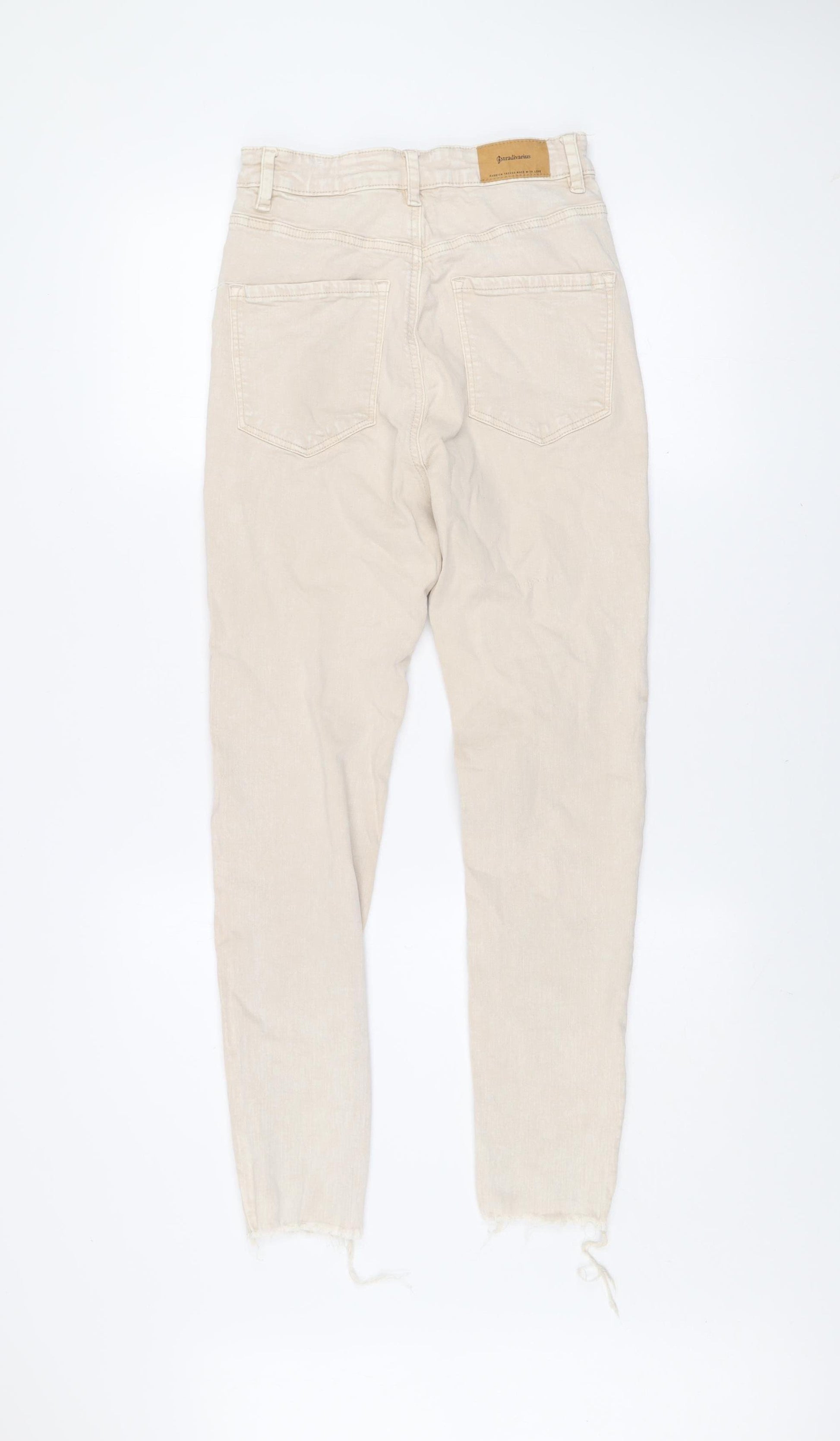Step up your casual wardrobe with these Stradivarius Women’s Beige High Waist Mom Jeans. Crafted from soft and durable cotton denim for natural comfort, these jeans offer a flattering silhouette that sits high on the waist to accentuate your shape. The light beige tone gives an easy neutral style perfect for pairing with almost any outfit, while the mom cut creates a relaxed fit through the hips and thighs tapering towards the ankle for a modern, versatile finish. Designed with a classic five-pocket layout, button and zip fastening, and subtle distressed raw hems adding contemporary appeal, these jeans are ideal for off-duty dressing and casual days out. Perfect for spring, summer or autumn wear, they provide breathable comfort and resilient style whether teamed with trainers, sandals or boots. The stretch-infused cotton ensures flexible movement making them both comfortable and stylish. In very good pre-loved condition, showing light general wear and a small repaired area, these jeans remain perfectly wearable and ready for their next adventure. An affordable designer-inspired staple that fits effortlessly into your everyday wardrobe, ideal for fashion-forward women who love understated, neutral tones. A Stradivarius favourite offering the right balance between comfort and trendy appeal – perfect to create timeless looks all year round.