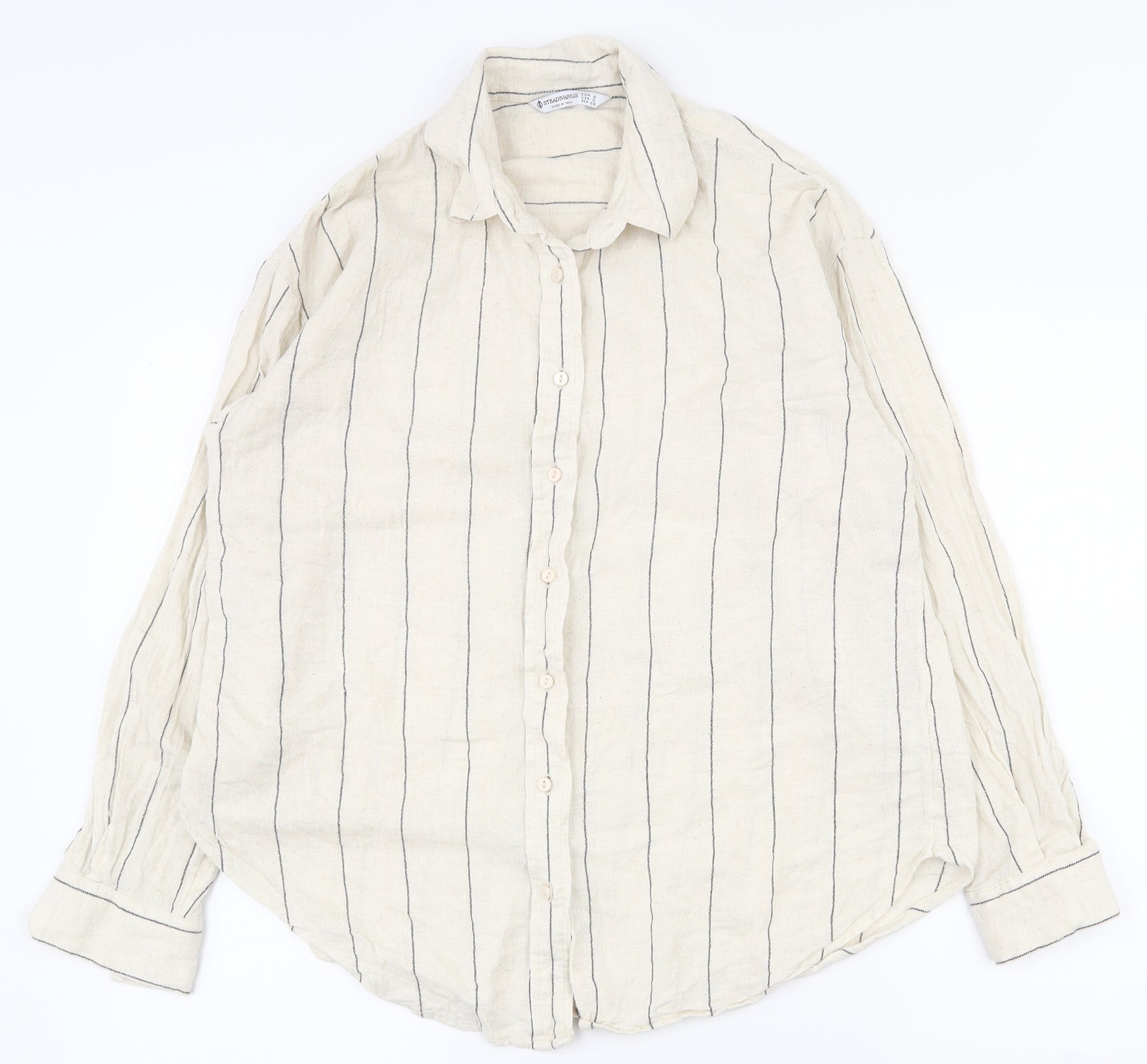 Womens Beige Striped Cotton Basic Button-Up Size S Collared