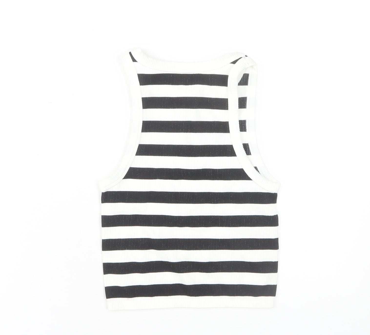Elevate your casual wardrobe with this chic black and white striped tank top from Stradivarius. Crafted for women, this XS sleeveless basic tank is ideal for summer days. Made from high-quality cotton, the knit fabric offers a comfortable fit and a smooth feel against the skin. The round neckline adds a classic appeal to this versatile top, making it perfect for casual outings or lounging at home. The simple pullover style allows for easy wearing, while the regular fit ensures a flattering silhouette. With a stylish striped pattern, this tank is both trendy and timeless, providing you with endless styling opportunities. Pair it with jeans or shorts for a relaxed yet fashionable look. Easy to care for, this piece is machine washable, ensuring convenience without compromising on style. Grab this wardrobe essential and embrace comfort and fashion in your everyday look.